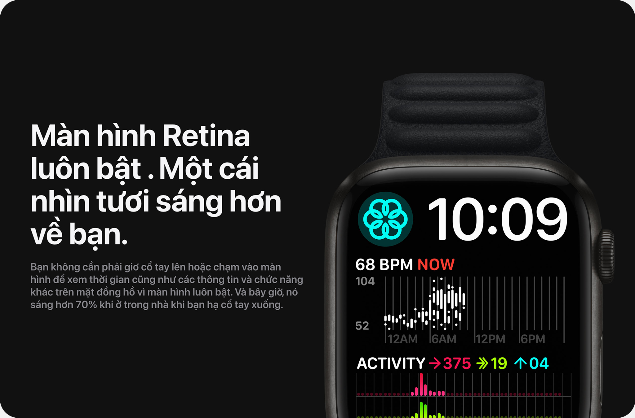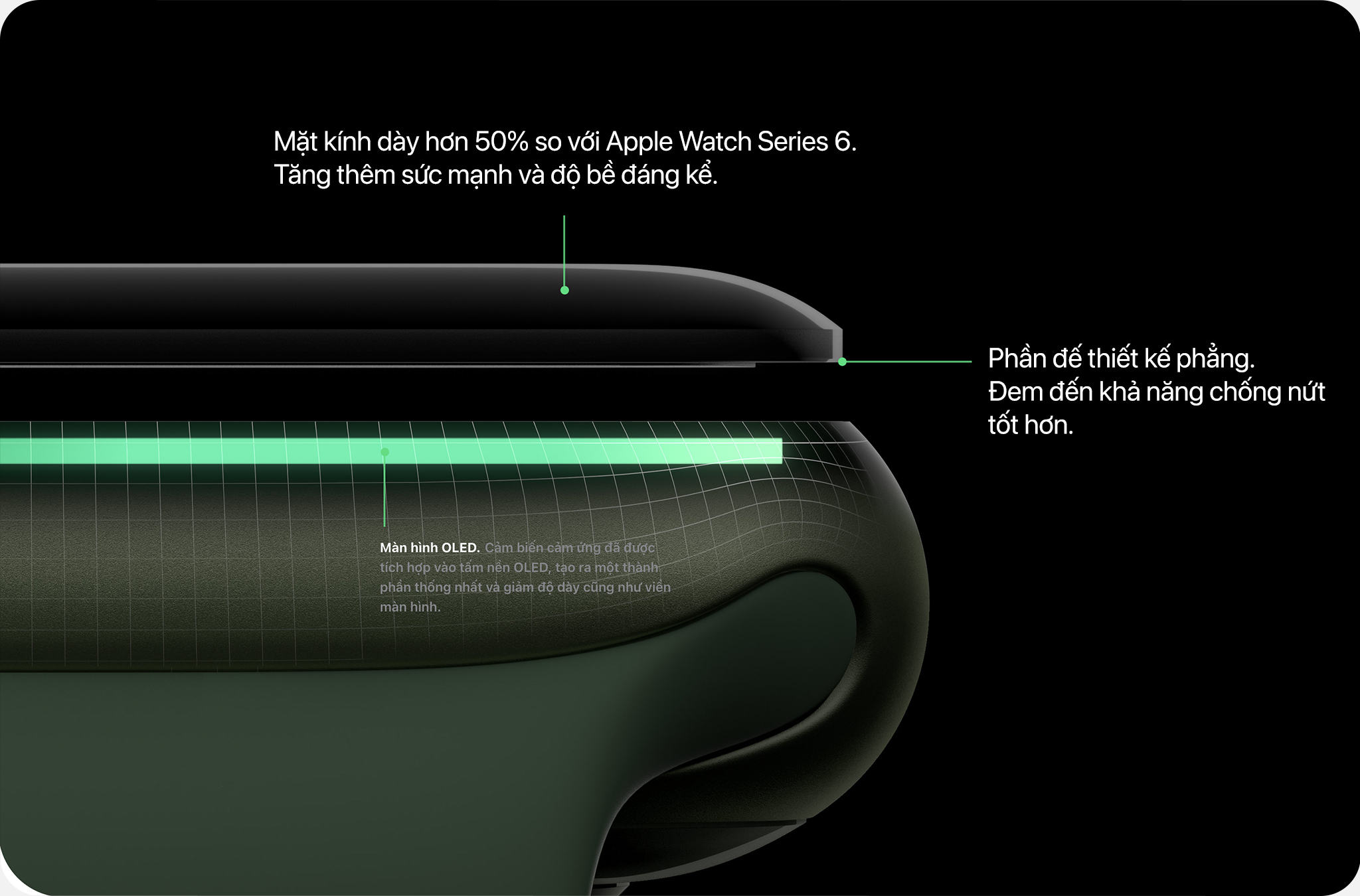 Apple tập trung toàn bộ sự chú ý vào màn hình trên chiếc Apple Watch S7 này. Đầu tiên là sự thay đổi về kích thước màn hình, Watch S7 được nâng cấp thêm 1mm từ đó nâng kích thước tổng thể lên 41mm và 45mm. Mặc dù màn hình lớn hơn nhưng kích thước của Apple Watch S7 vẫn được giữ nguyên. Điều này có được là nhờ phần viền màn hình được tối ưu mỏng hơn rất nhiều phiên bản tiền nhiệm.