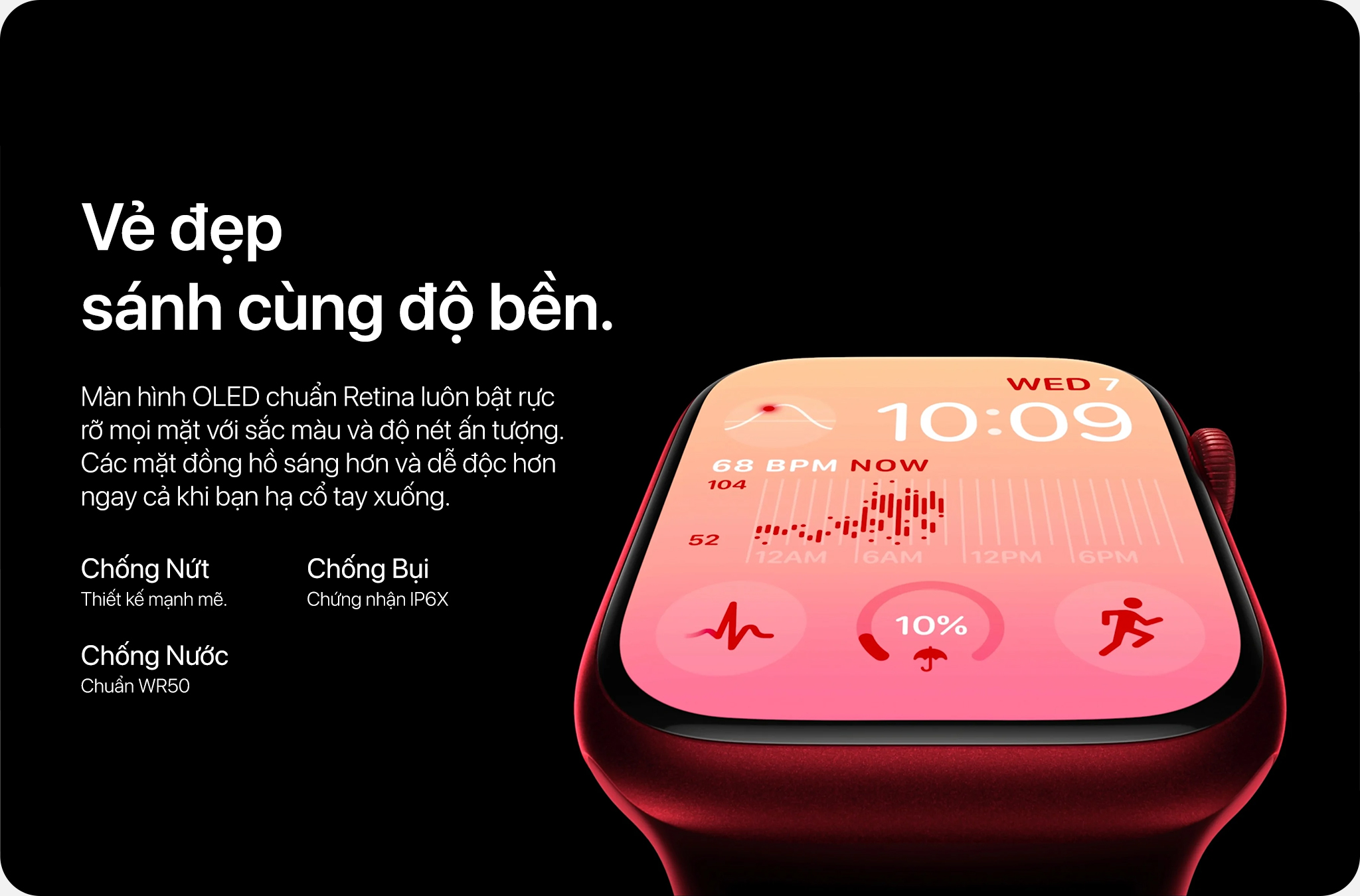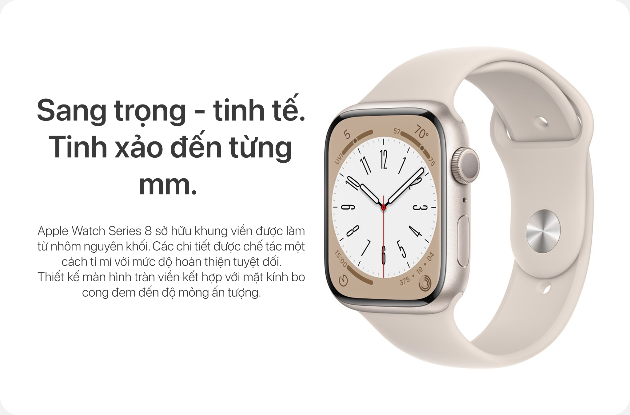 Apple Watch Series 8 sở hữu bề ngoài sang trọng, tinh tế. Phần viền nhôm được đúc nguyên khối mang lại sự liền mạch, các góc được bo tròn tỉ mỉ kết hợp cùng mặt kính pha lê được vát cong lên phía trên cho cảm giác vô cùng mềm mại nhưng không kém phần chắc chắn, bền bỉ.