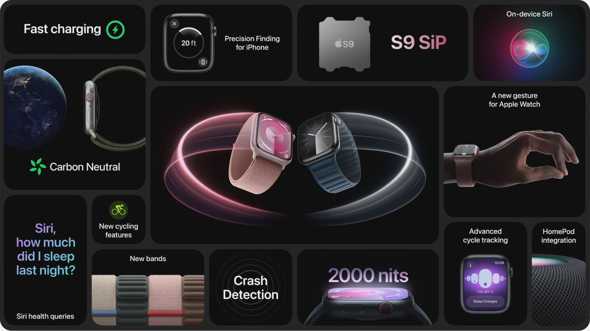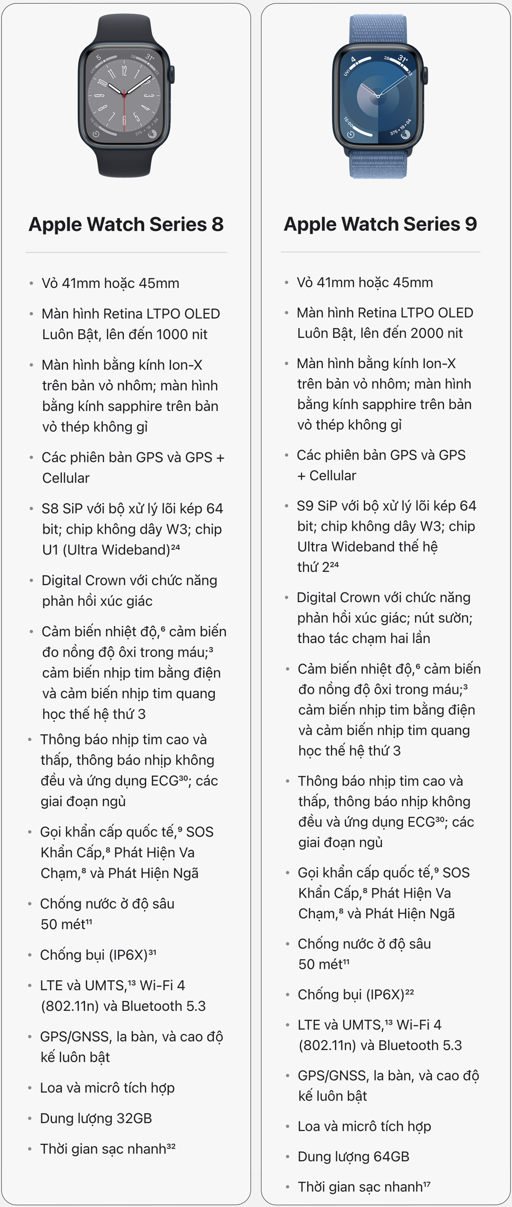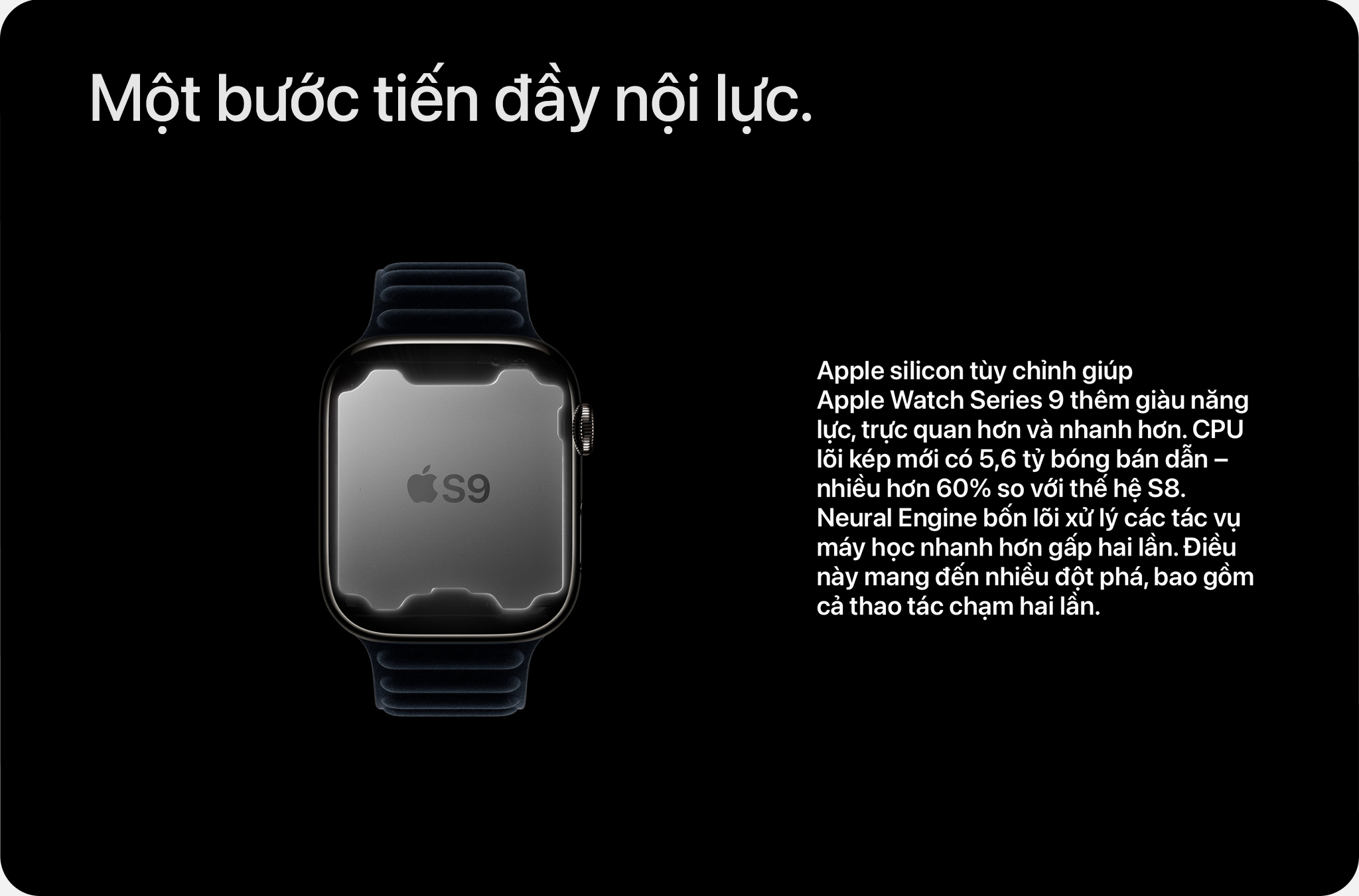 - Apple Watch Series 9 trang bị con chip S9 SiP được nâng cấp đáng kể với 5,6 tỷ bóng bán dẫn - tăng 60% so với thế hệ S8.