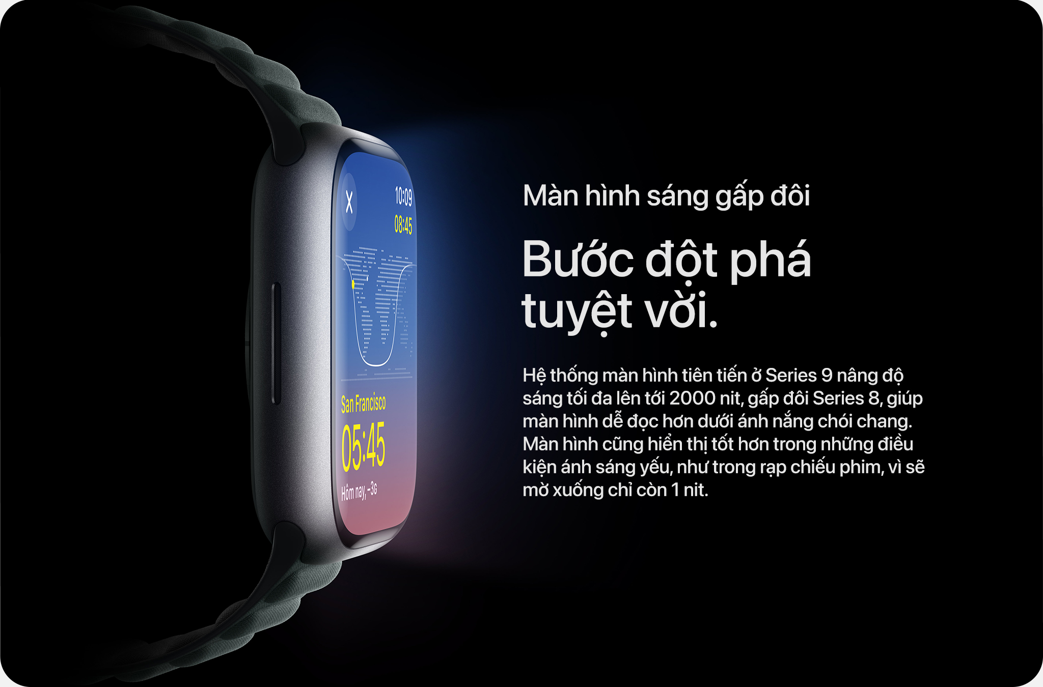 - Màn hình có độ sáng 2000 nit (tăng 100% so với Apple Watch S8), giúp hiển thị sắc nét dưới ánh nắng mặt trời