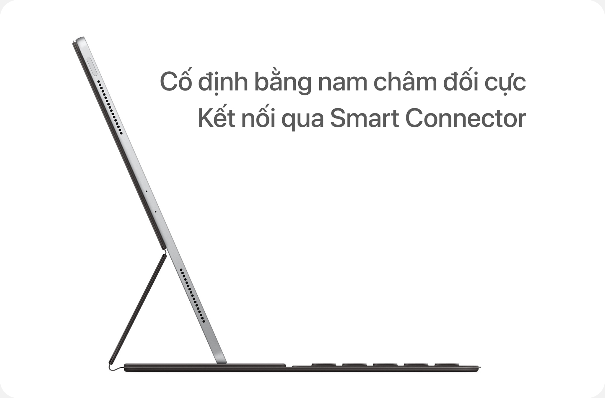 Smart Keyboard Folio for iPad được trang bị kết nối thông minh Smart Connector thay vì các kết nối truyền thống như Bluetooth hay Lightning. Kết nối thông minh này mang lại cho người dùng một trải nghiệm khác biệt và dễ chịu hơn. Thay vì phải kết nối bằng các bước cài đặt phức tạp, bạn chỉ cần đặt mặt lưng của iPad vào bàn phím, Smart Connector sẽ tự động hít vào nhau và kết nối ngay lập tức. Điều này giúp cho việc kết nối nhanh và dễ dàng hơn bao giờ hết.