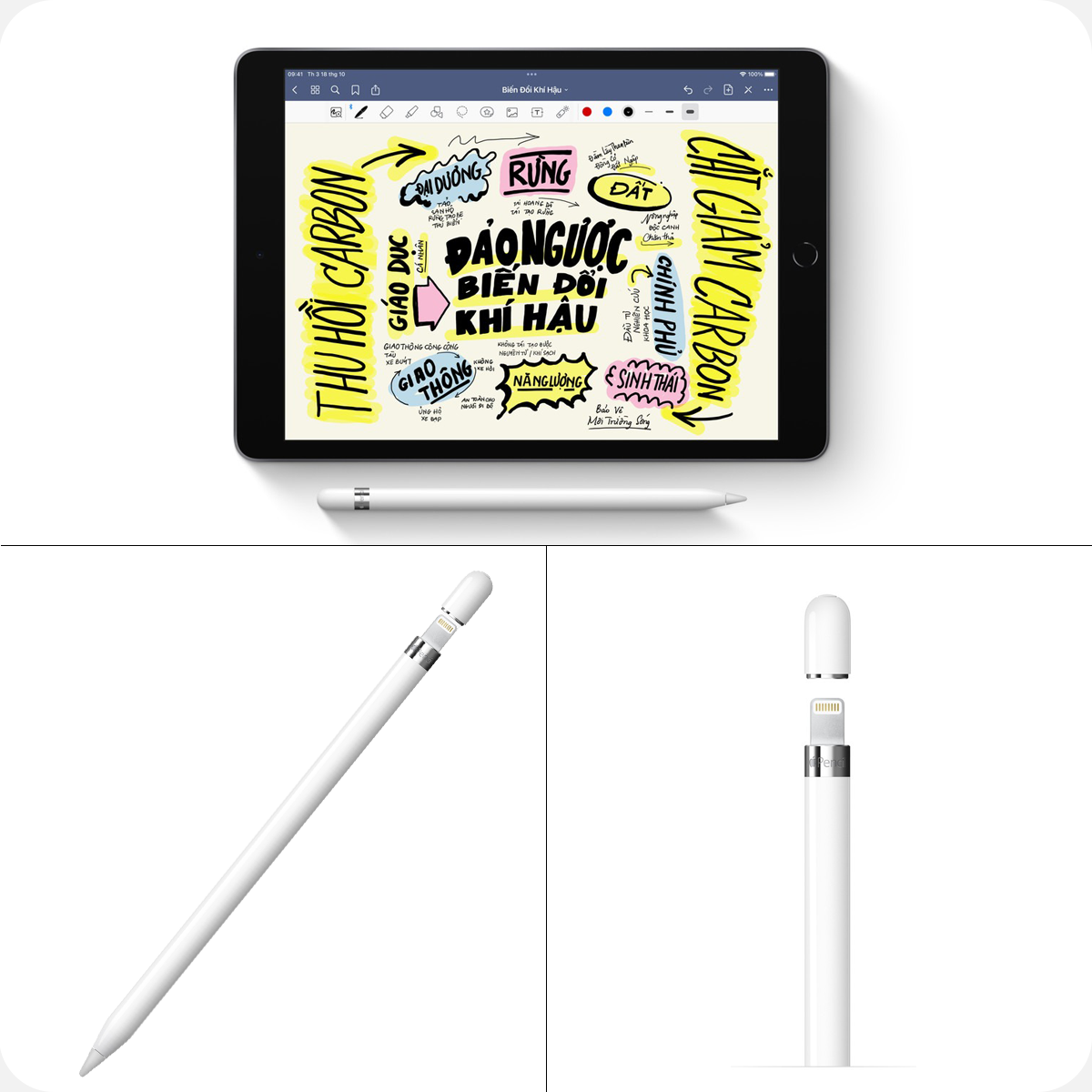 - Apple Pencil 1 có thiết kế hình trụ thuôn dài giống những chiếc bút quen thuộc. Chất liệu làm từ nhựa trắng bóng sang trọng. Phần đuôi bút có tích hợp cổng Lightning để sạc và kết nối với iPad - đây là đặc điểm dễ nhận biết nhất của Apple Pencil 1. Ngoài ra, Apple Pencil 1 là chiếc bút duy nhất được Apple trang bị phụ kiện theo kèm gồm: 1 ngòi bút thay thế, 1 Adapter Lightning, 1 Adapter USB-C to Lightning
