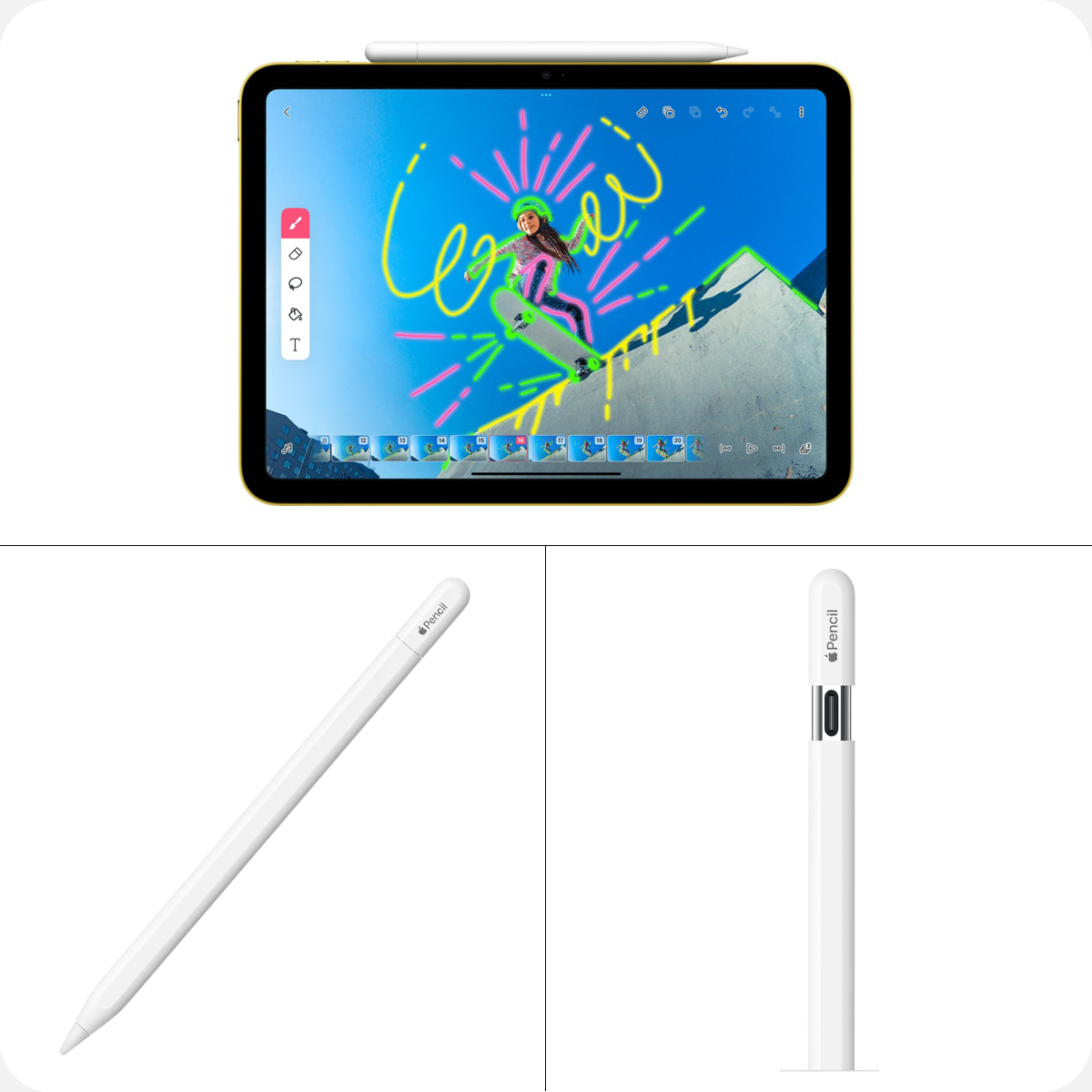 - Apple Pencil USB-C có kiểu dáng giống với Apple Pencil 2. Điểm khác biệt nằm ở phần đuôi bút, nó có thể trượt lên/xuống để mở phần cổng sạc USB-C bên trong. Mặc dù Apple Pencil USB-C có thể hít được vào cạnh của iPad nhưng nó không thể kết nối và sạc không dây, mà buộc phải thực hiện thủ công qua cổng USB-C
