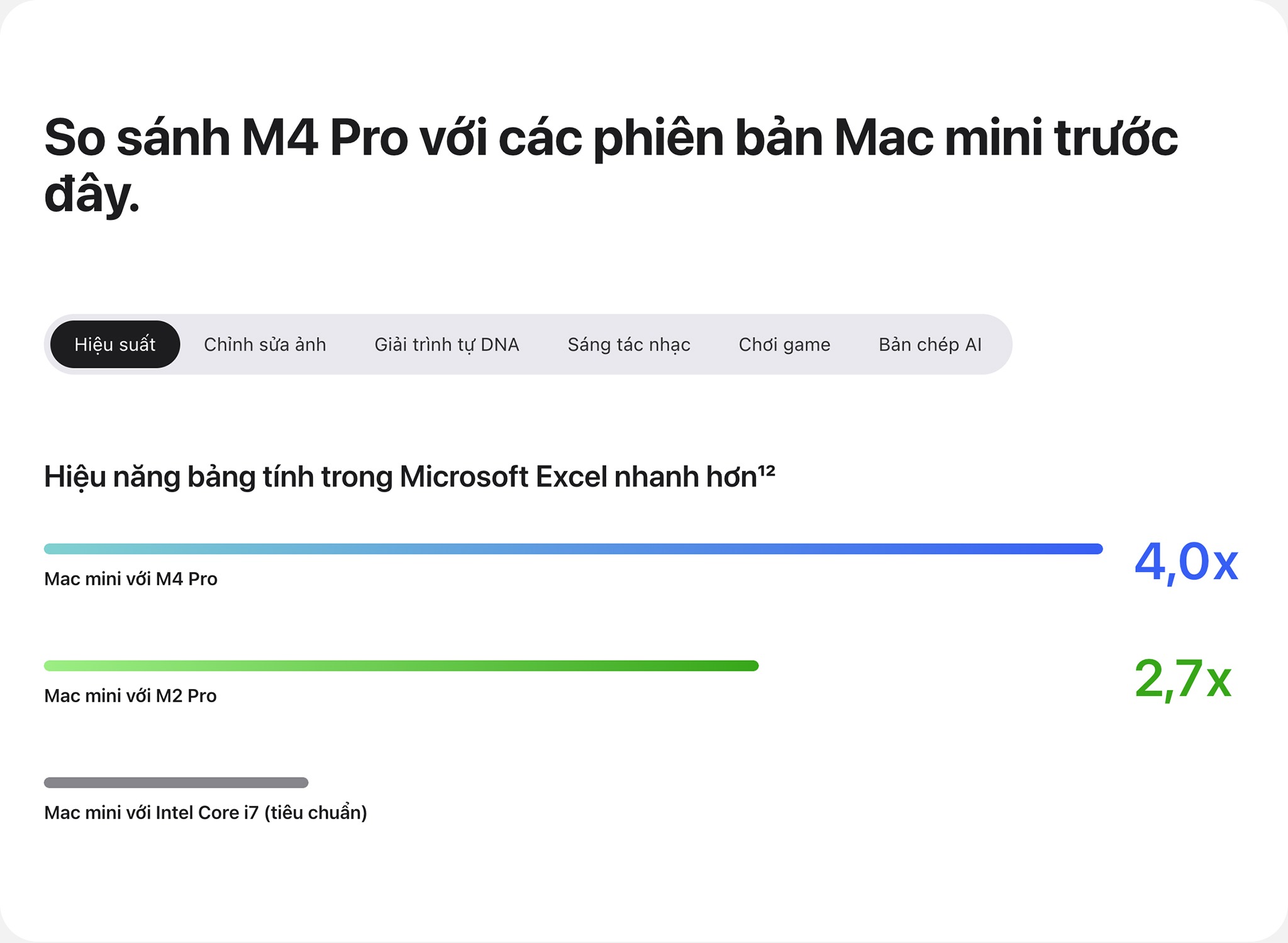 Về hiệu năng, Mac mini M4 Pro với CPU 14 mang đến sự cải thiện đáng kể về hiệu suất so với phiên bản M4, đặc biệt trong các tác vụ nặng về đồ họa và xử lý dữ liệu. Theo Apple, chip M4 Pro có hiệu suất nhanh hơn 2,5 lần so với chip M1 Pro, giúp các tác vụ như lập trình, dựng phim 4K và xử lý dữ liệu lớn diễn ra mượt mà và nhanh chóng hơn. Điểm hiệu năng đơn nhân của M4 Pro trên Geekbench 6 đạt 3925, một bước tiến lớn trong sức mạnh đơn luồng. 20 nhân GPU thế hệ mới trên M4 Pro kết hợp với công nghệ dò tia tốc độ cao bằng phần cứng (Ray tracing) giúp M4 Pro có khả năng xử lí đồ họa vượt trội, đáp ứng nhu cầu thiết kế đồ họa chuyên sâu và chơi game AAA với tốc độ khung hình cao.