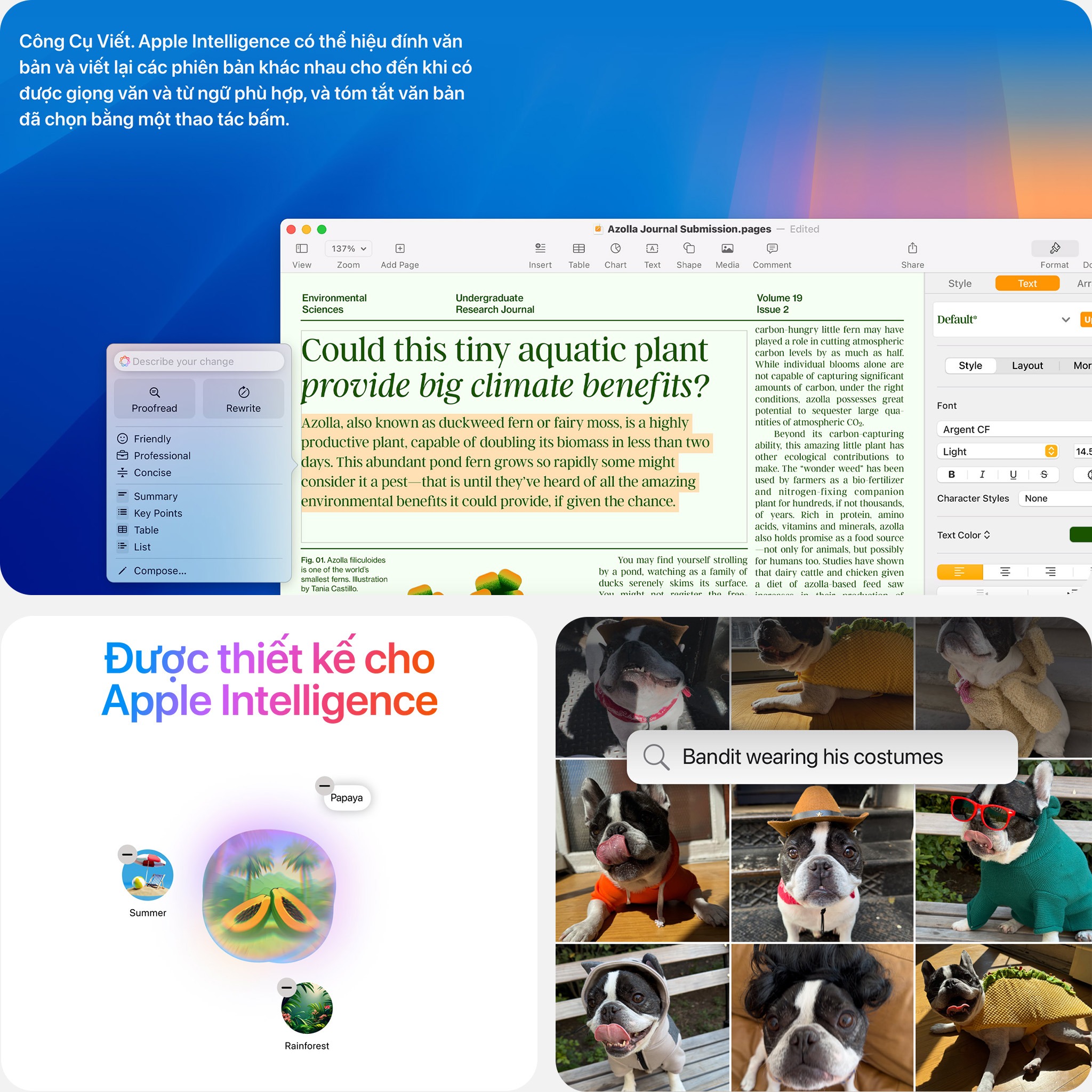 Nhờ kết hợp những mô hình tạo sinh mạnh mẽ với các tính năng bảo vệ quyền riêng tư lần đầu xuất hiện trong ngành, Apple Intelligence khai thác sức mạnh của Apple silicon và Neural Engine giúp mở ra những cách mới để người dùng làm việc, giao tiếp và thể hiện bản thân trên Mac. Công cụ viết trên toàn hệ thống giúp người dùng có thể tinh chỉnh từ ngữ của mình bằng cách viết lại, hiệu đính và tóm tắt văn bản gần như ở mọi nơi họ viết. Với Siri được thiết kế lại, người dùng có thể chuyển đổi liền mạch giữa các yêu cầu được nói và nhập để tăng tốc các tác vụ trong suốt cả ngày. Siri cũng có thể trả lời hàng ngàn câu hỏi về máy Mac cũng như các sản phẩm khác của Apple. Các tính năng mới của Apple Intelligence như Image Playground sẽ đem đến cho người dùng một phương thức mới để tạo ra những hình ảnh độc đáo, vui nhộn, cùng với Genmoji, tính năng cho phép người dùng tạo ra biểu tượng tùy chỉnh chỉ trong vài giây. Siri sẽ trở nên giàu năng lực hơn với khả năng thực hiện tác vụ trên hệ thống và cung cấp thông tin phù hợp dựa trên ngữ cảnh cá nhân của người dùng. Apple cho biết, ChatGPT sẽ sớm được tích hợp vào Siri và Công cụ viết, cho phép người dùng truy cập vào kho kiến thức chuyên môn của nền tảng này mà không cần phải chuyển đổi giữa các công cụ.