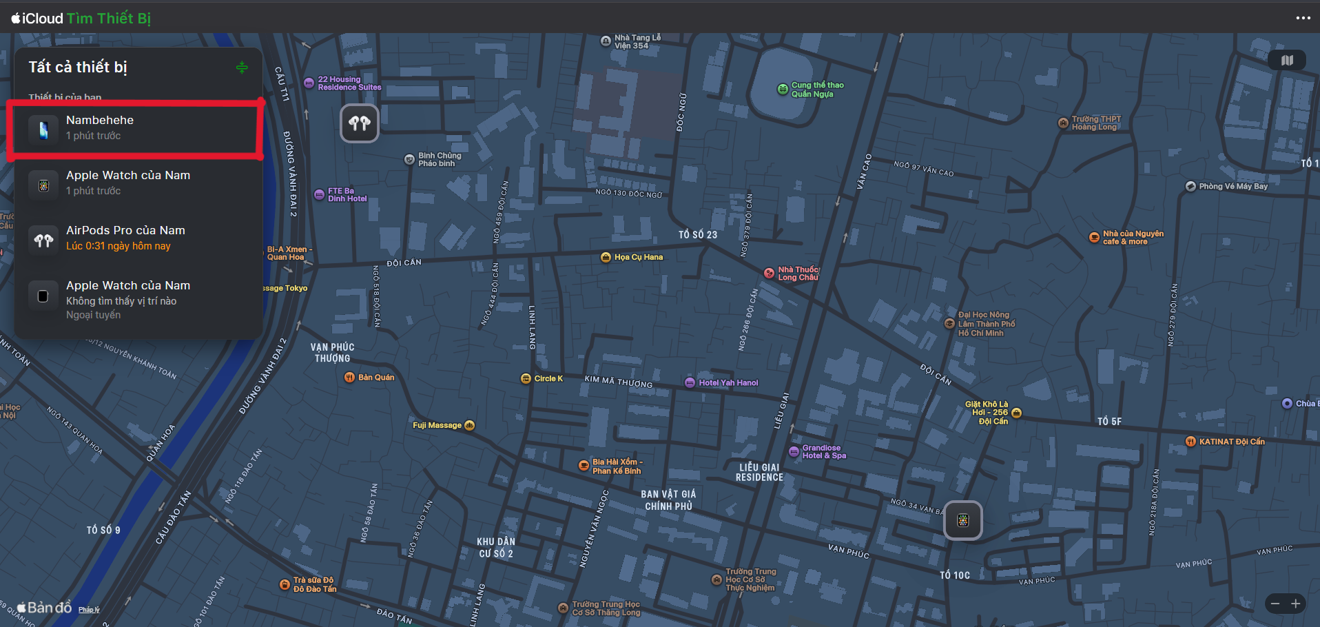 Bước 3: Tại giao diện "Bản đồ tìm", chọn "Tất cả thiết bị", sau đó chọn thiết bị bị mất