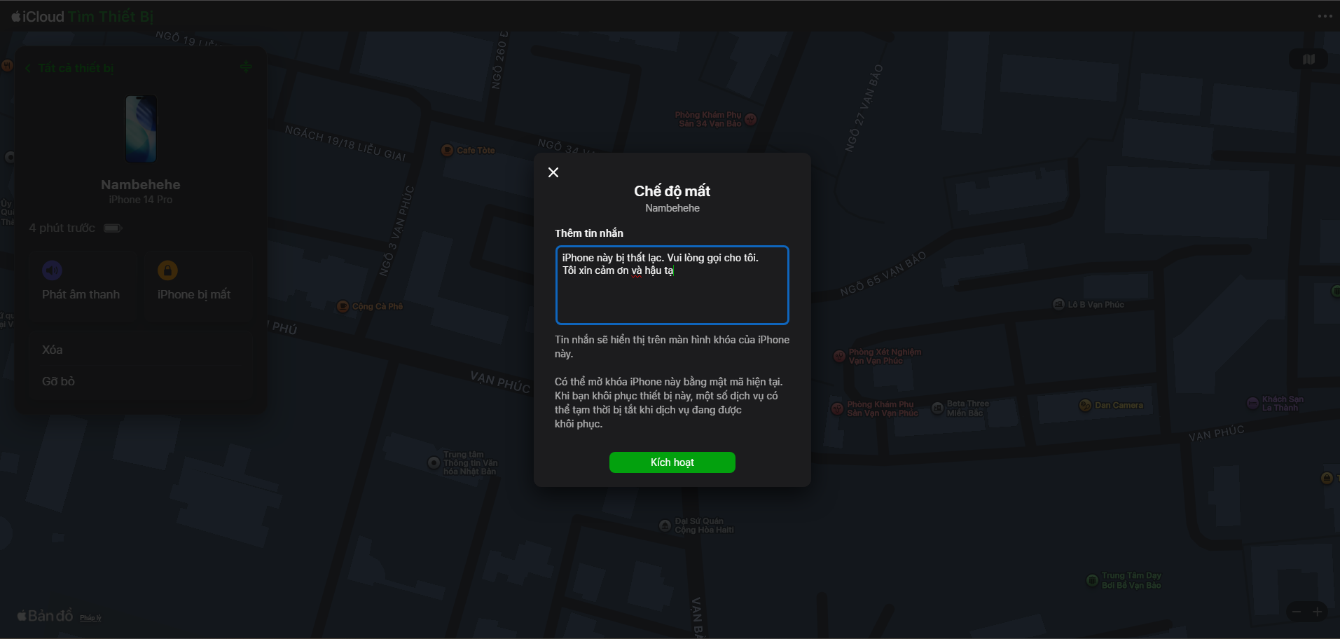 Bước 4: Chọn "iPhone/iPad bị mất", sau đó điền SĐT và lời nhắn rồi nhấn "Kích hoạt"