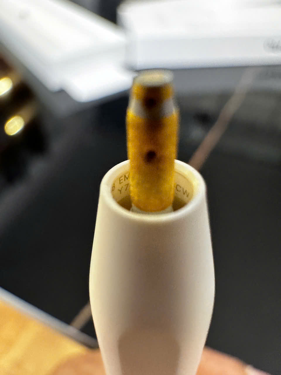 - Xoay phần ngòi nhựa bên ngoài để kiểm tra phần ruột ngòi bên trong. Ruột ngòi bút chính hãng được mạ vàng, hơi nhám (ảnh bên dưới).