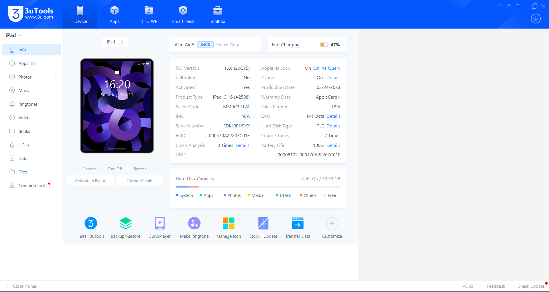 Tải ứng dụng 3Utools trên máy tính, sau đó mở lên. Dùng dây cáp - một đầu cắm vào máy tính, đầu còn lại cắm vào iPad, sau đó thông tin của máy sẽ hiển thị trên 3Utools.