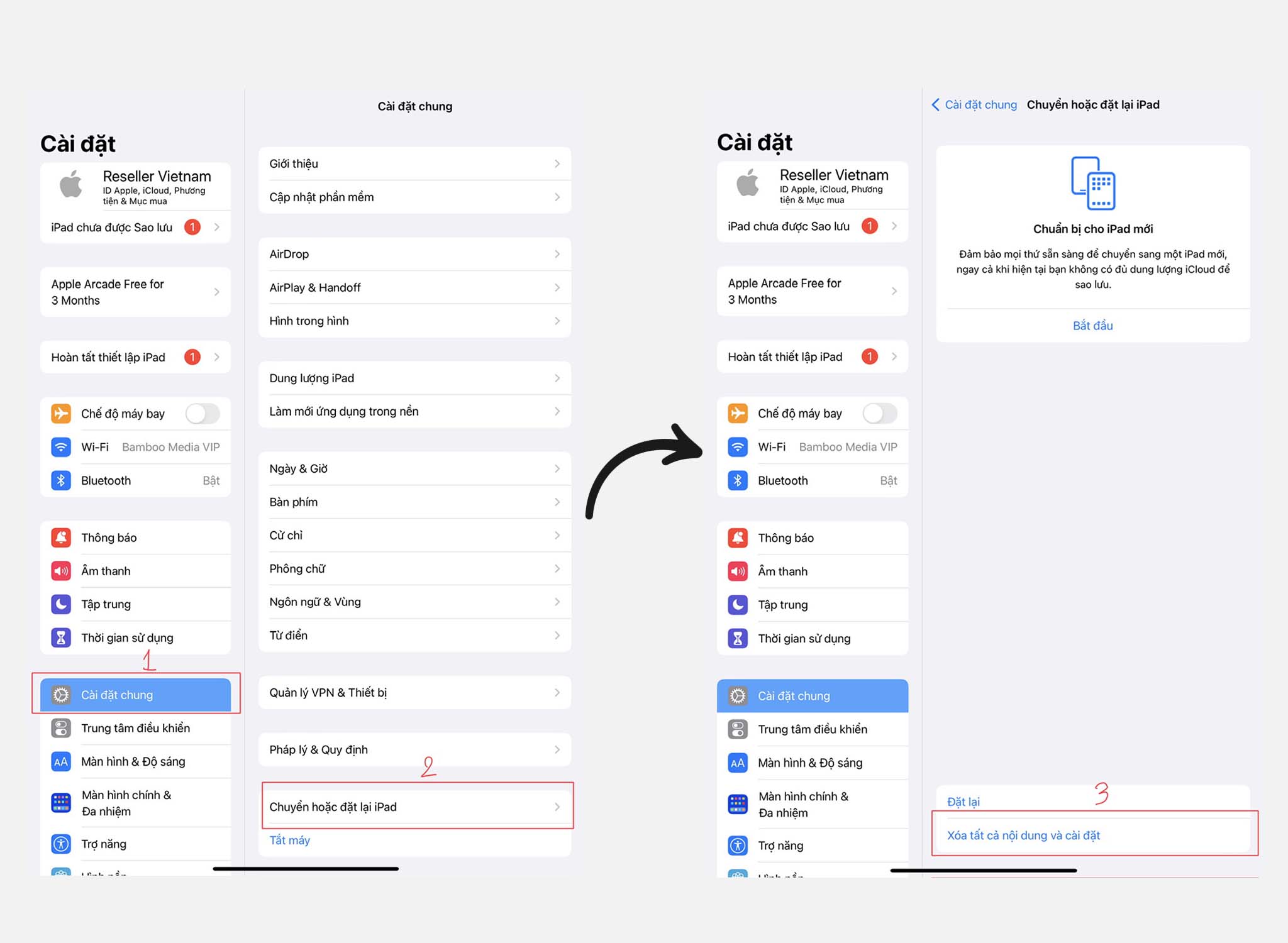 Cài đặt -> Cài đặt chung -> Chuyển hoặc đặt lại iPad -> Xóa tất cả nội dung và cài đặt.