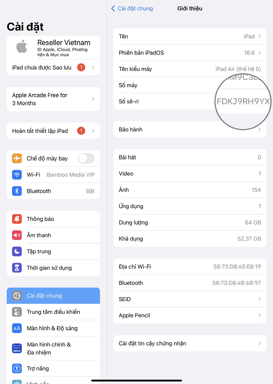- Kiểm tra Serial trên máy: Cài đặt -> Cài đặt chung -> Giới thiệu.