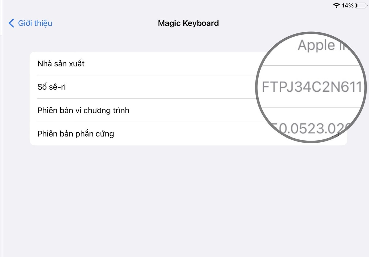 - Đặt máy vào bàn phím, sau đó vào Cài đặt -> Cài đặt chung -> Giới thiệu vuốt xuống cuối và chọn Magic Keyboard để xem số serial, nếu trùng với số serial trên bàn phím thì chắc chắn bàn phím của bạn là hàng chính hãng. Ngược lại, nếu số serial không trùng hoặc không hiện thì rất có thể đó là hàng fa.ke.