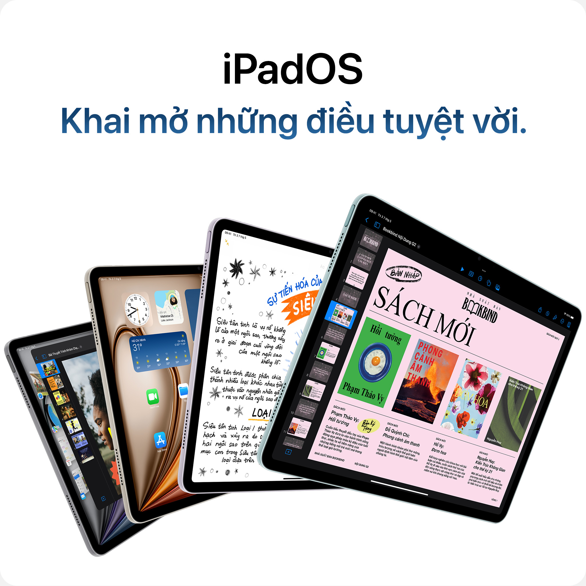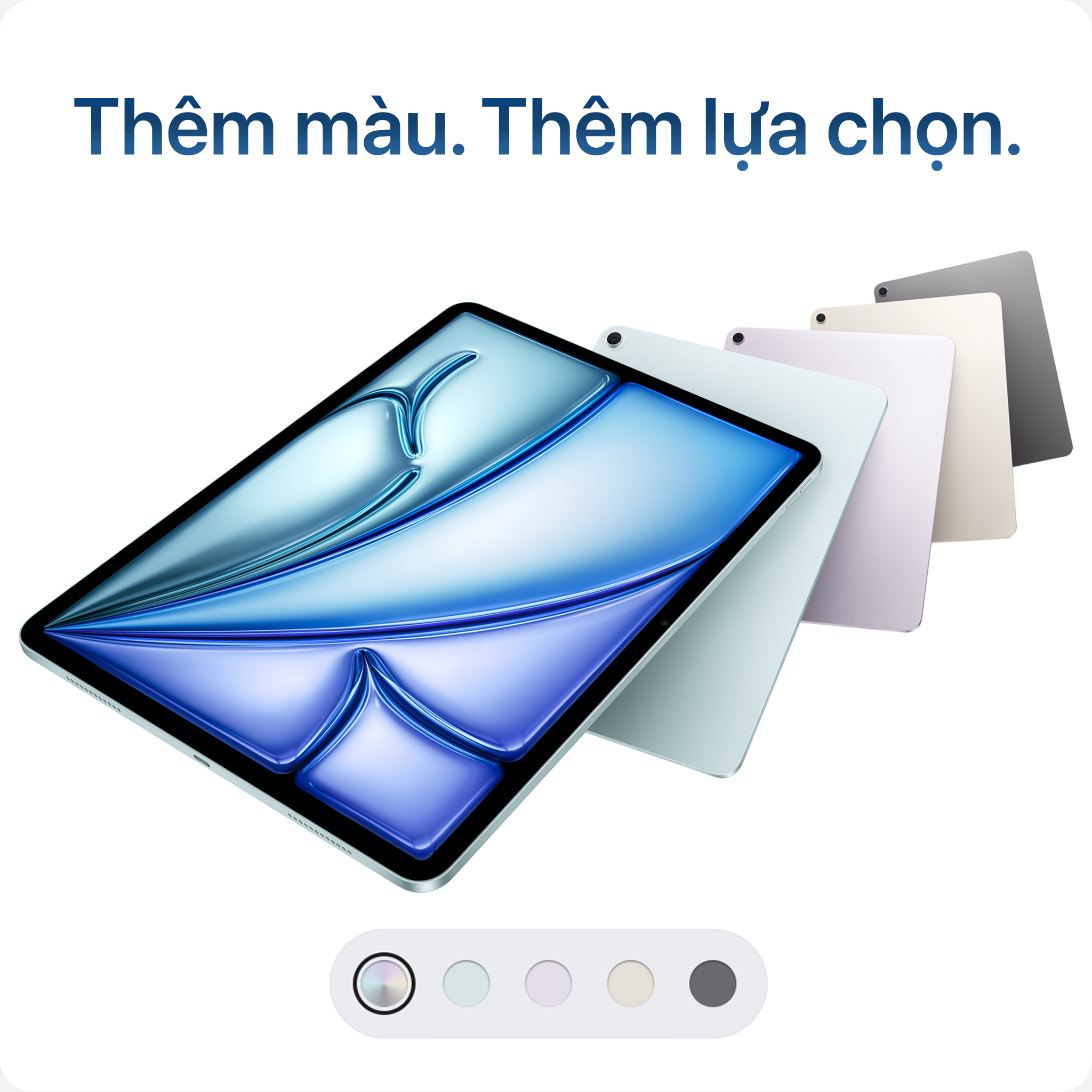 iPad Air 2025 mang đến bốn tùy chọn màu sắc thời thượng, gồm: Xanh dương, Tím, Ánh sao và Xám không gian, đáp ứng phong cách cá nhân của từng người dùng.