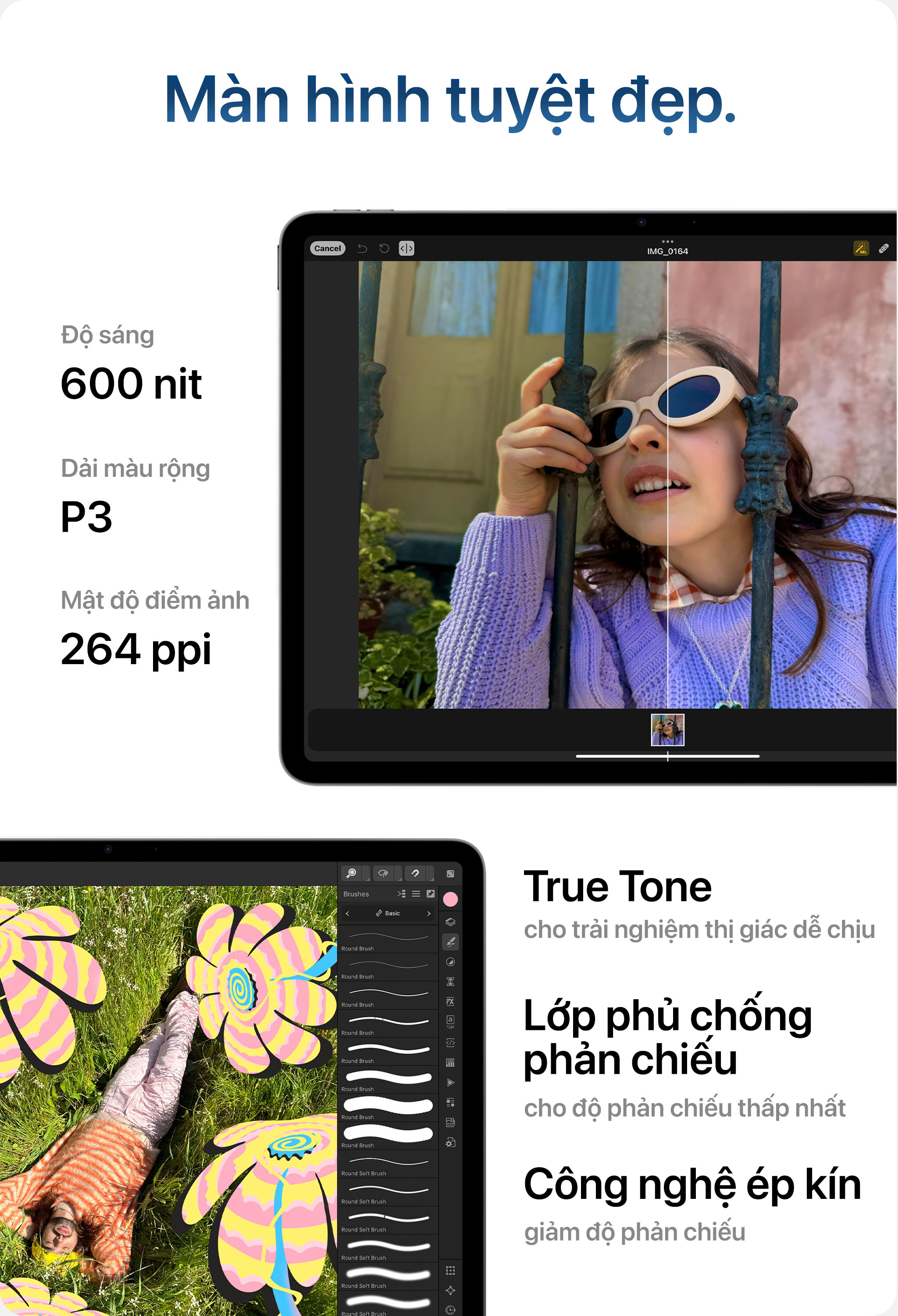 - Màn hình Liquid Retina với độ sáng tối đa 600 nits mang đến hình ảnh chân thực, sắc nét