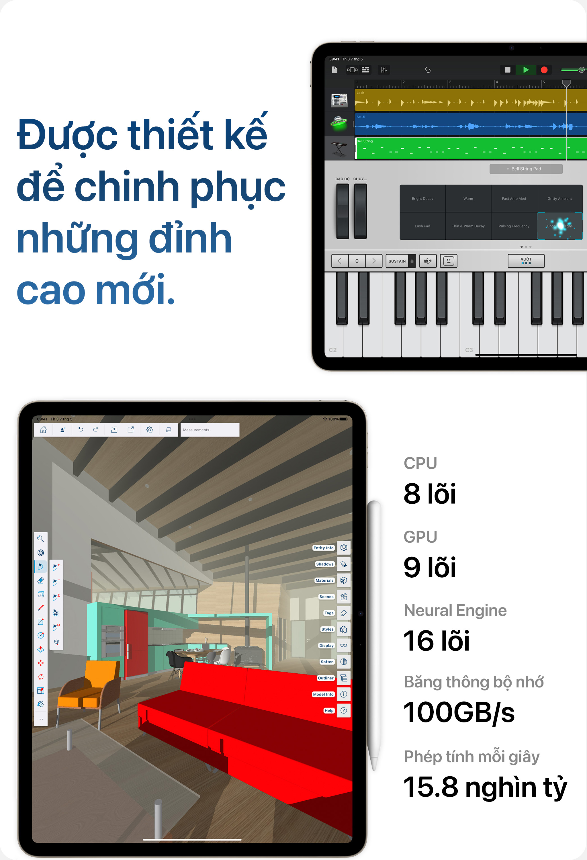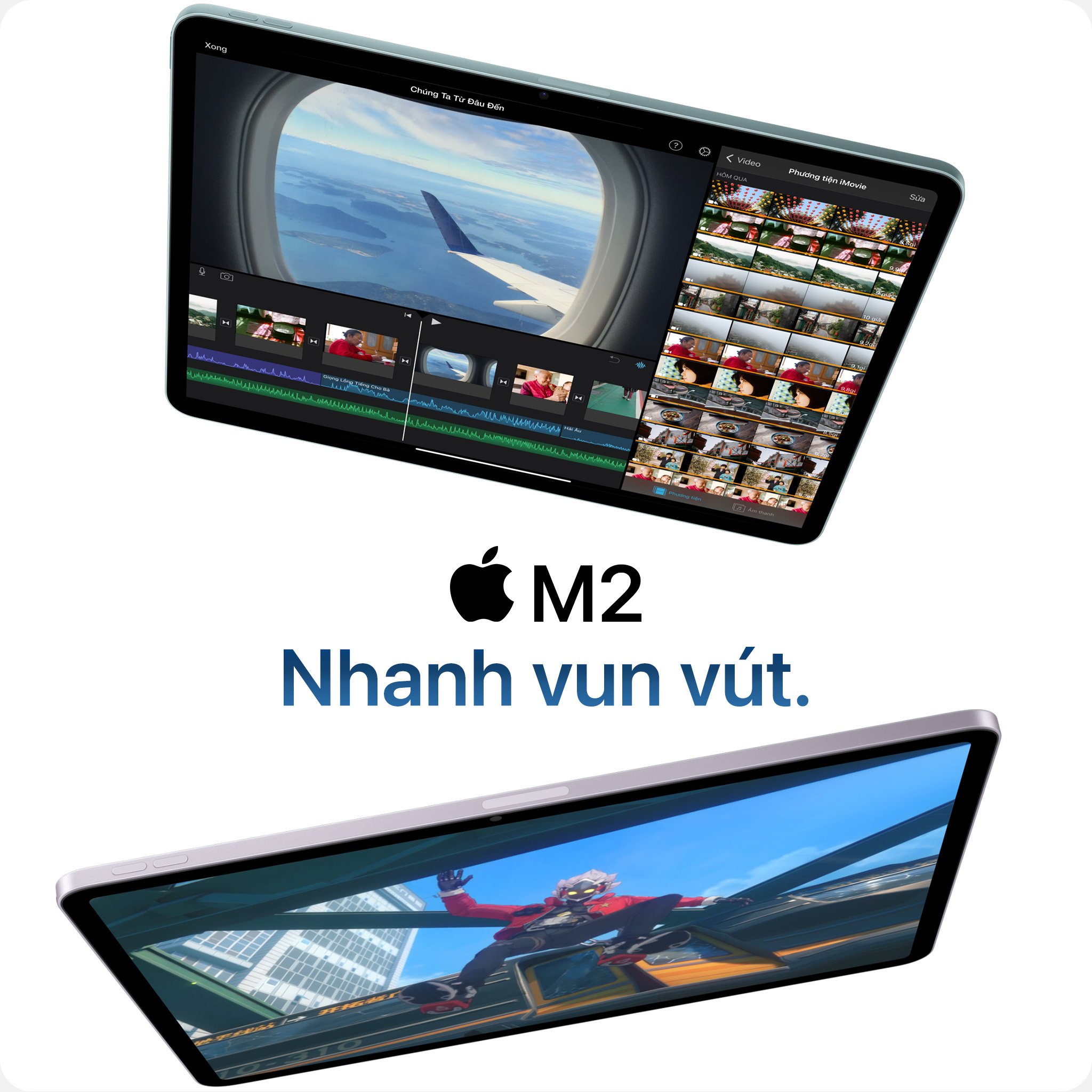 iPad Air 2025 được Apple nâng cấp mạnh mẽ với vi xử lý M3 – con chip từng làm nên tên tuổi trên các dòng MacBook cao cấp. Chip M3 sở hữu CPU 8 nhân với 4 nhân hiệu năng và 4 nhân tiết kiệm điện, giúp xử lý mọi tác vụ hàng ngày, từ cơ bản đến nâng cao một cách mượt mà. GPU 9 nhân của M3 mang lại hiệu năng đồ họa nhanh hơn 40% so với iPad Air M1, các công nghệ tiên tiến như Dynamic Caching, Mesh Shading tích hợp trên GPU mang đến khả năng xử lý hình ảnh, video cũng như đồ họa 3D chân thực hơn bao giờ hết. Ngoài ra, 16 lõi Neural Engine được cải tiến giúp iPad Air M3 trở thành thiết bị lý tưởng cho các ứng dụng trí tuệ nhân tạo (AI), mở ra tiềm năng sáng tạo không giới hạn.