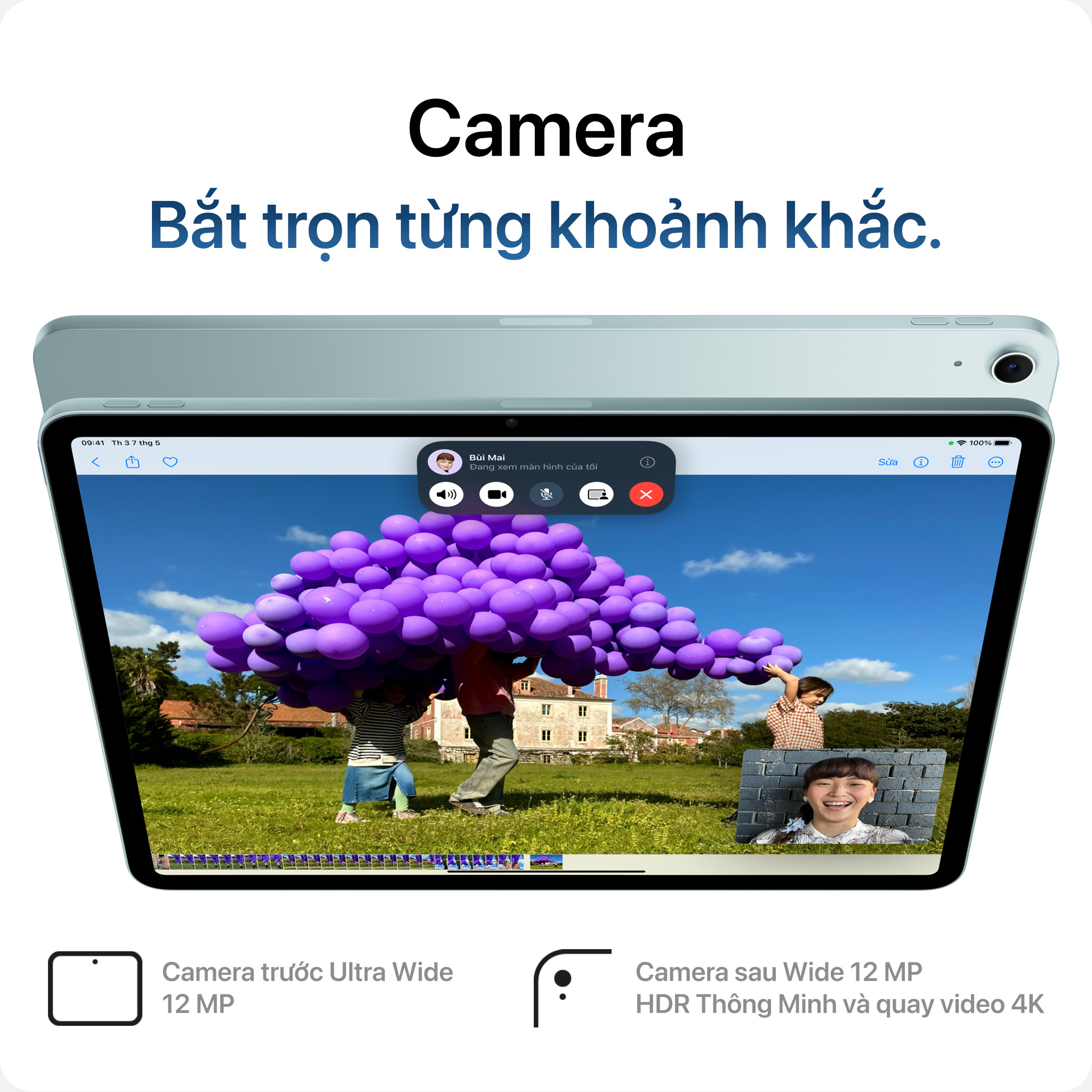 Cụm Camera sau trên iPad Air thế hệ 7 không có quá nhiều khác biệt, sự thay đổi chủ yếu tập trung vào cụm Camera trước. Camera trước Ultra Wide 12MP nằm trên cạnh ngang hỗ trợ tính năng Center Stage giúp cho bạn luôn ở giữa khung hình, sự nâng cấp này mang đến trải nghiệm gọi video hoàn hảo hơn, nhất là khi sử dụng kèm Magic Keyboard