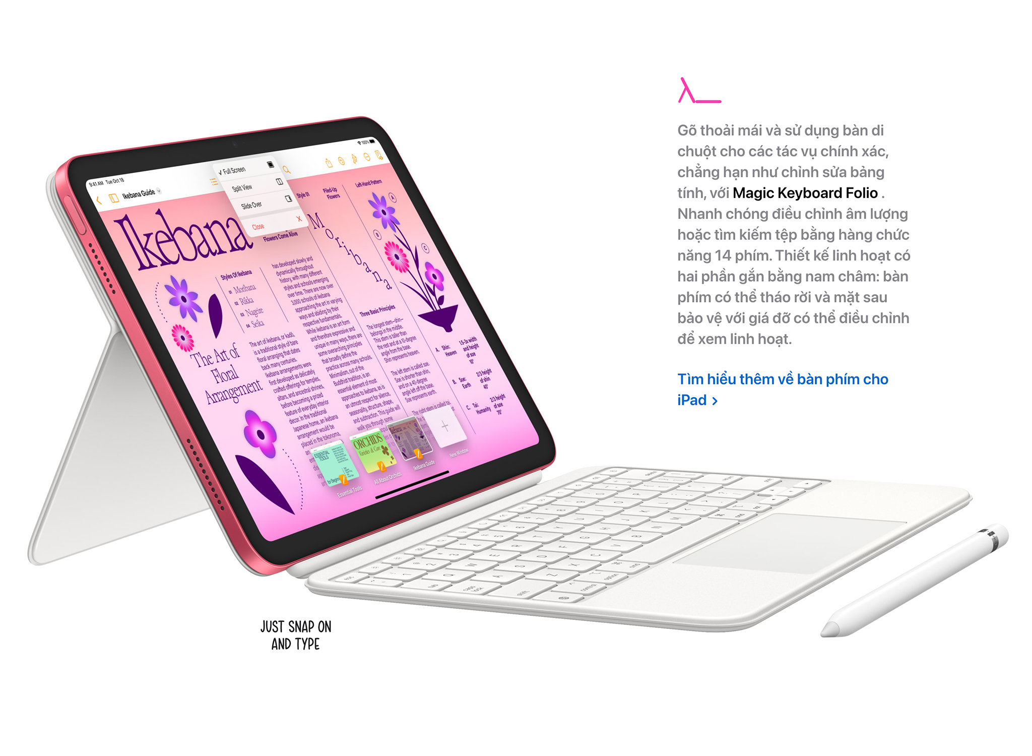Với Magic Keyboard Folio, iPad của bạn không còn là chiếc máy tính bảng đơn thuần. Bạn hoàn toàn có thể sử dụng để gõ văn bản hoặc sử dụng bàn di chuột như một chiếc Laptop thu nhỏ, nhờ đó có thể gia tăng hiệu suất làm việc cũng như giải trí.