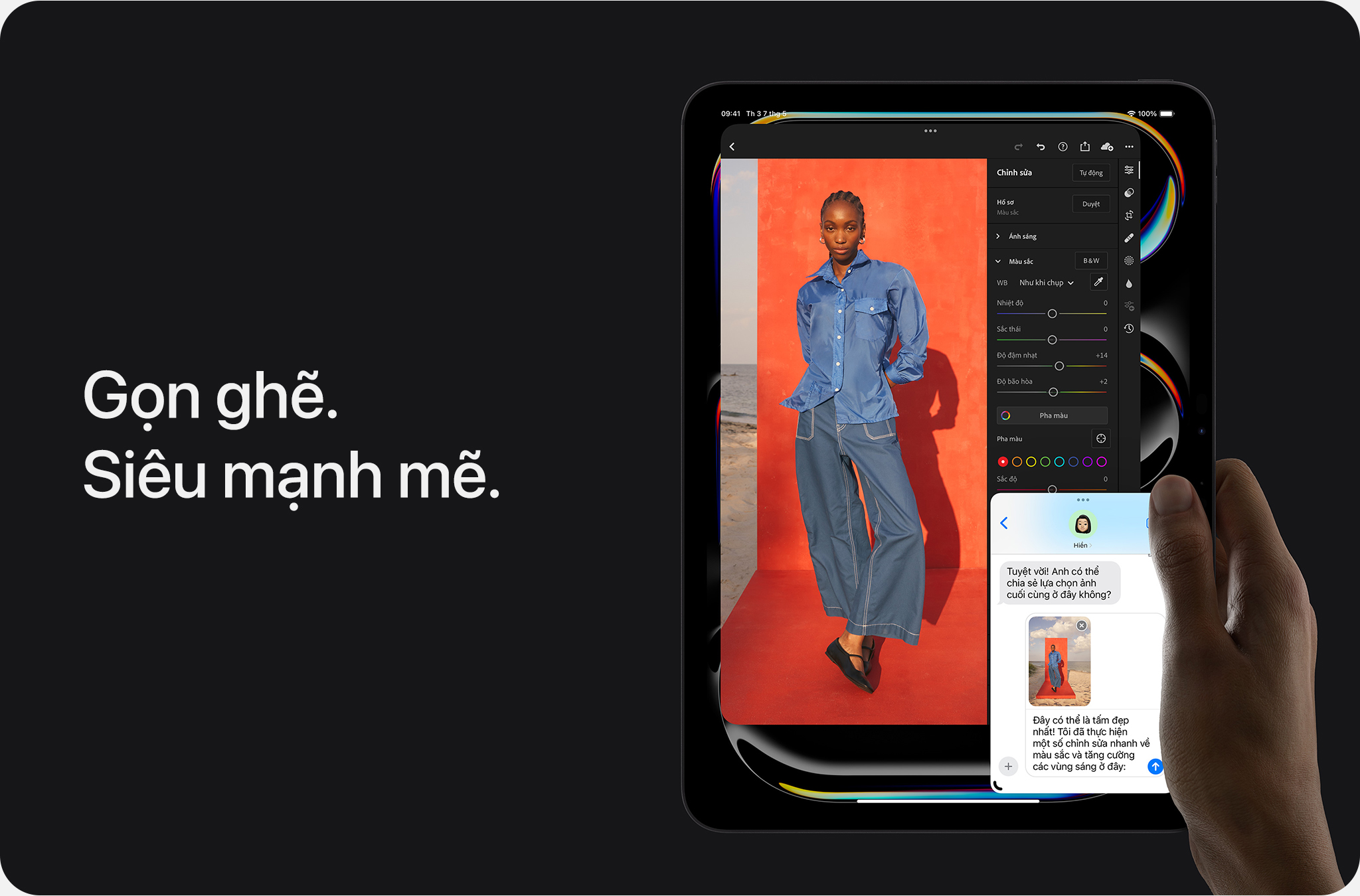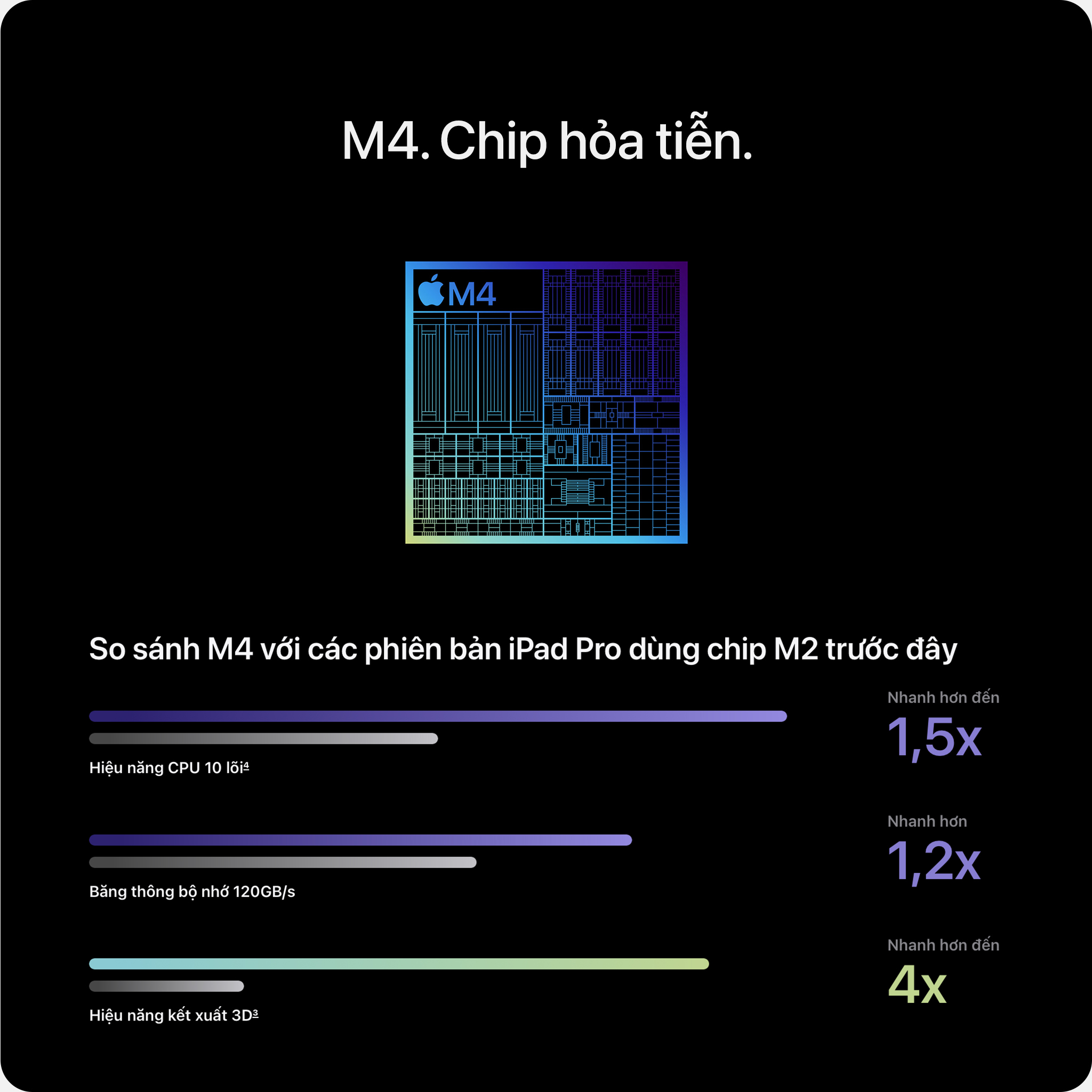 Chip Apple M4 được sản xuất trên tiến tình 3nm thế hệ thứ 2 với nhiều cải tiến đáng kinh ngạc.Chip có bộ xử lý hiển thị (Display Engine) hoàn toàn mới được thiết kế với những công nghệ tiên phong, mang đến độ chính xác, màu sắc và độ sáng ấn tượng cho màn hình Ultra Retina XDR đột phá trên iPad Pro.