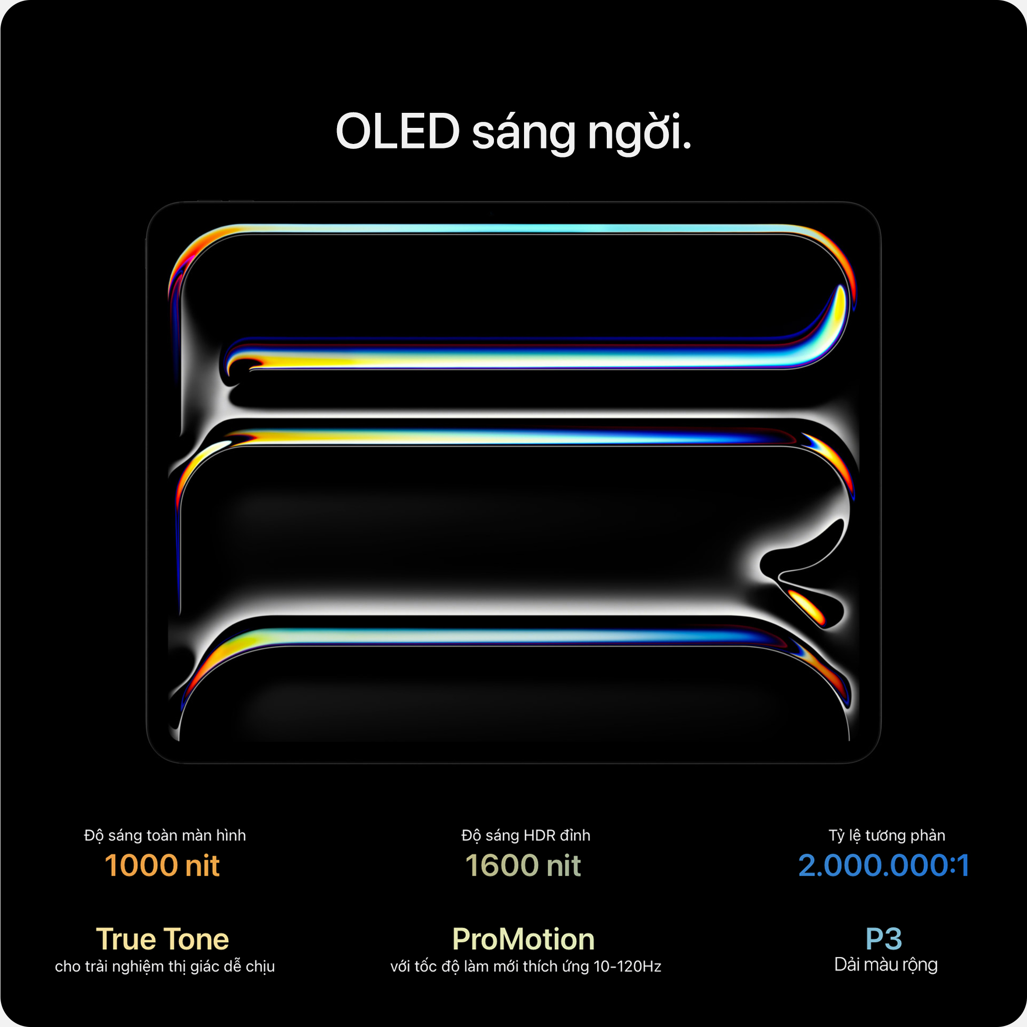 Thiết kế siêu mỏng của iPad Pro M4 một phần đến từ việc sử dụng tấm nền OLED, các Pixel trên tấm nền này có thể tự phát sáng độc lập từ đó sẽ loại bỏ được lớp đèn nền để tối ưu được độ mỏng cho iPad.