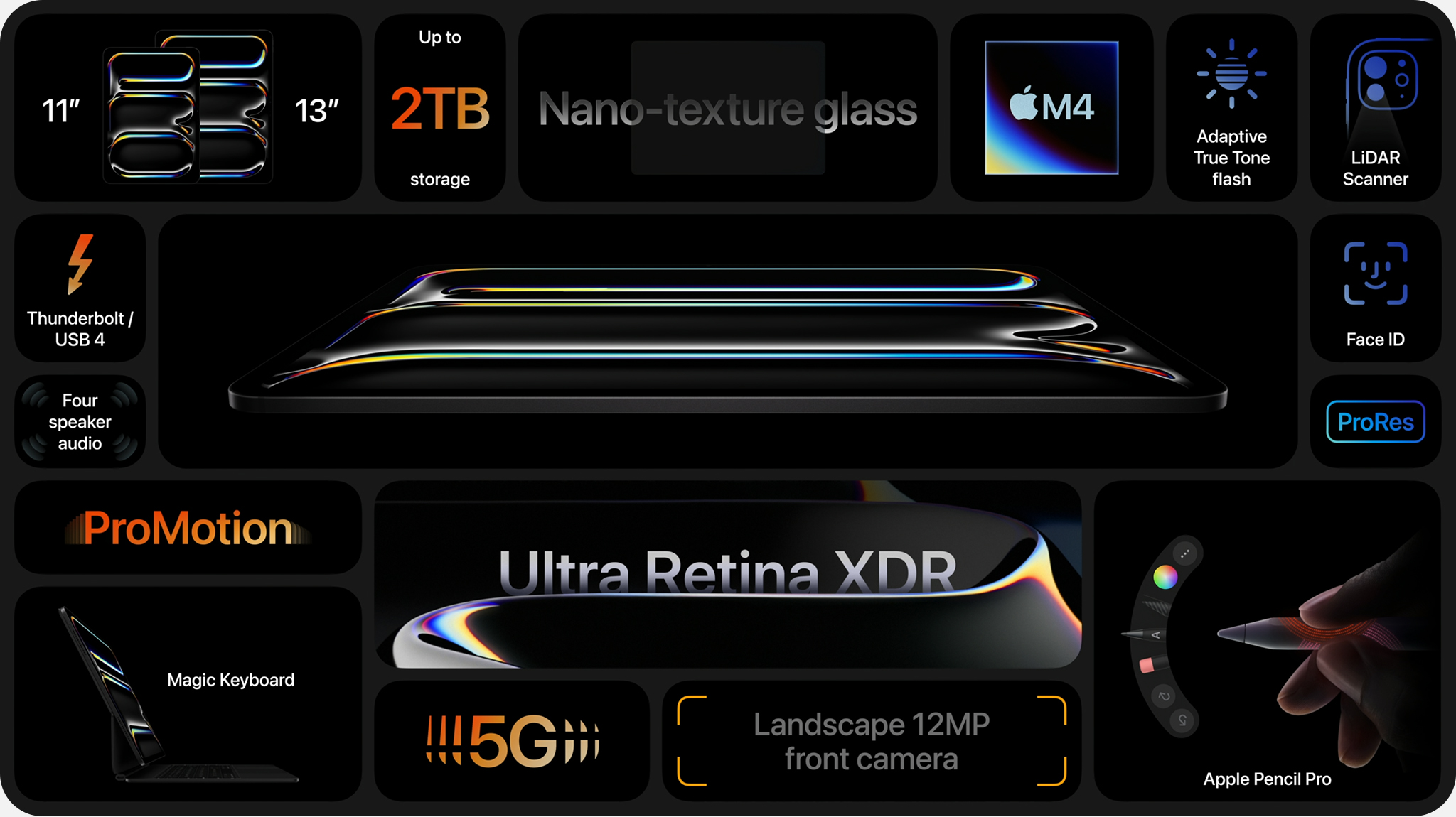 iPad Pro M4 là chiếc máy tính bảng đầu tiên được Apple ưu ái trang bị màn hình chuẩn Ultra Retina XDR với công nghệ xếp chồng hai tấm nền OLED được gọi là "Tandem OLED" áp dụng cho cả hai phiên bản màn hình 11-inch và 13-inch. Công nghệ màn hình mới là nền tảng để iPad Pro 2024 có thể đạt độ sáng toàn màn hình 1000 nits và độ sáng tối đa lên đến 1600 nits cho các nội dung HDR.
