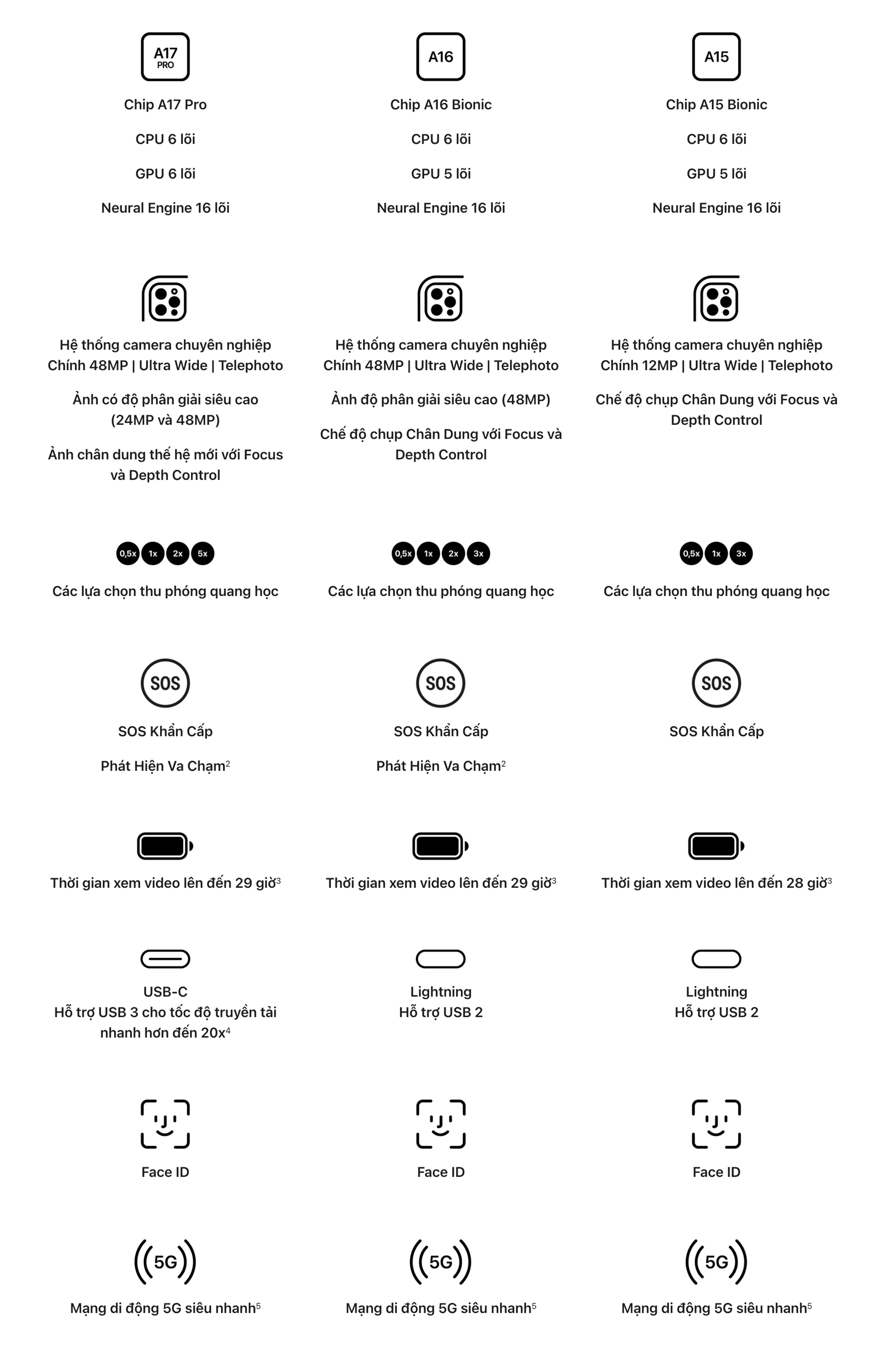 | Chipset | A17 Pro, 6 nhân CPU, 6 nhân GPU, kết hợp công nghệ Ray-Tracing |