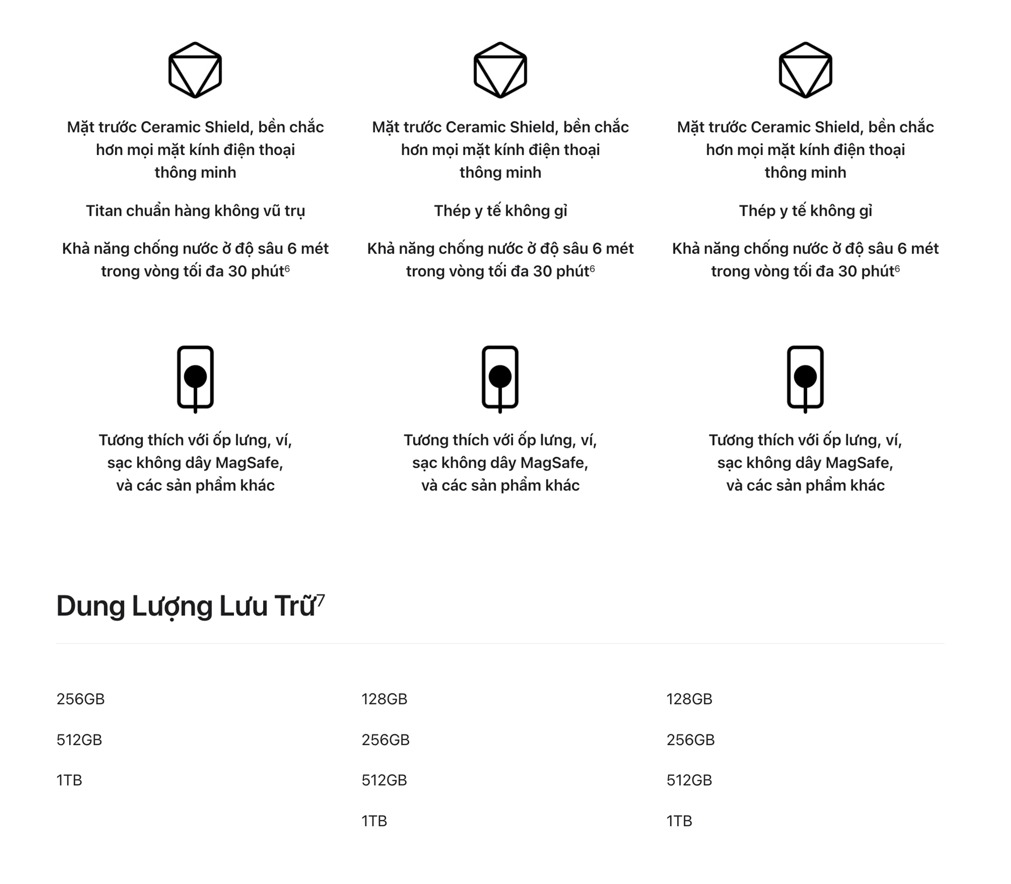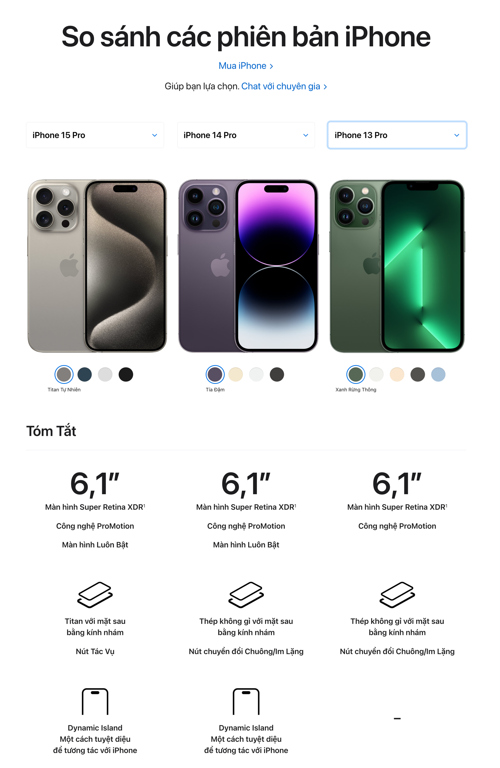 | Màn hình | Màn hình Super Retina XDR, 6.1-inchs tích hợp Dynamic Island, ProMotion với tốc độ làm mới thích ứng lên đến 120Hz, độ phân giải 2556x1179 Pixel |