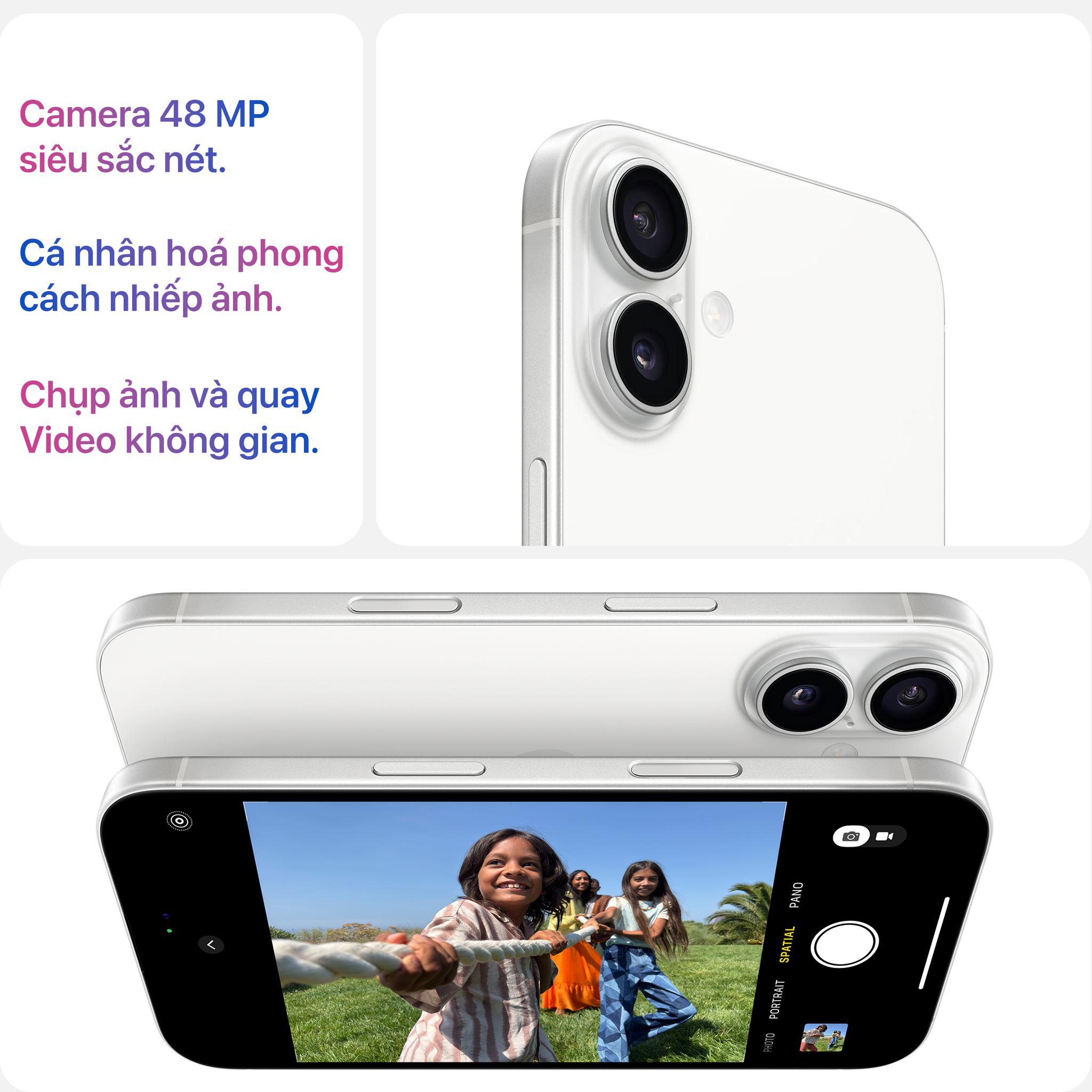 Nhờ các Camera được tinh chỉnh lại, iPhone 16 cho phép người dùng chụp ảnh và quay video không gian tuyệt đẹp, đây là tính năng mới hoàn toàn, lần đầu có mặt trên các dòng iPhone 16 Series. Chưa hết, sự kết hợp giữa Apple Intelligence cùng tính năng quay video với Âm thanh không gian, mang đến một tính năng mới - Hòa Âm. Hòa Âm giúp bạn có thể điều chỉnh giọng nói trong Video với ba lựa chọn âm thanh khác nhau: Trong khung hình, Studio, Điện ảnh.