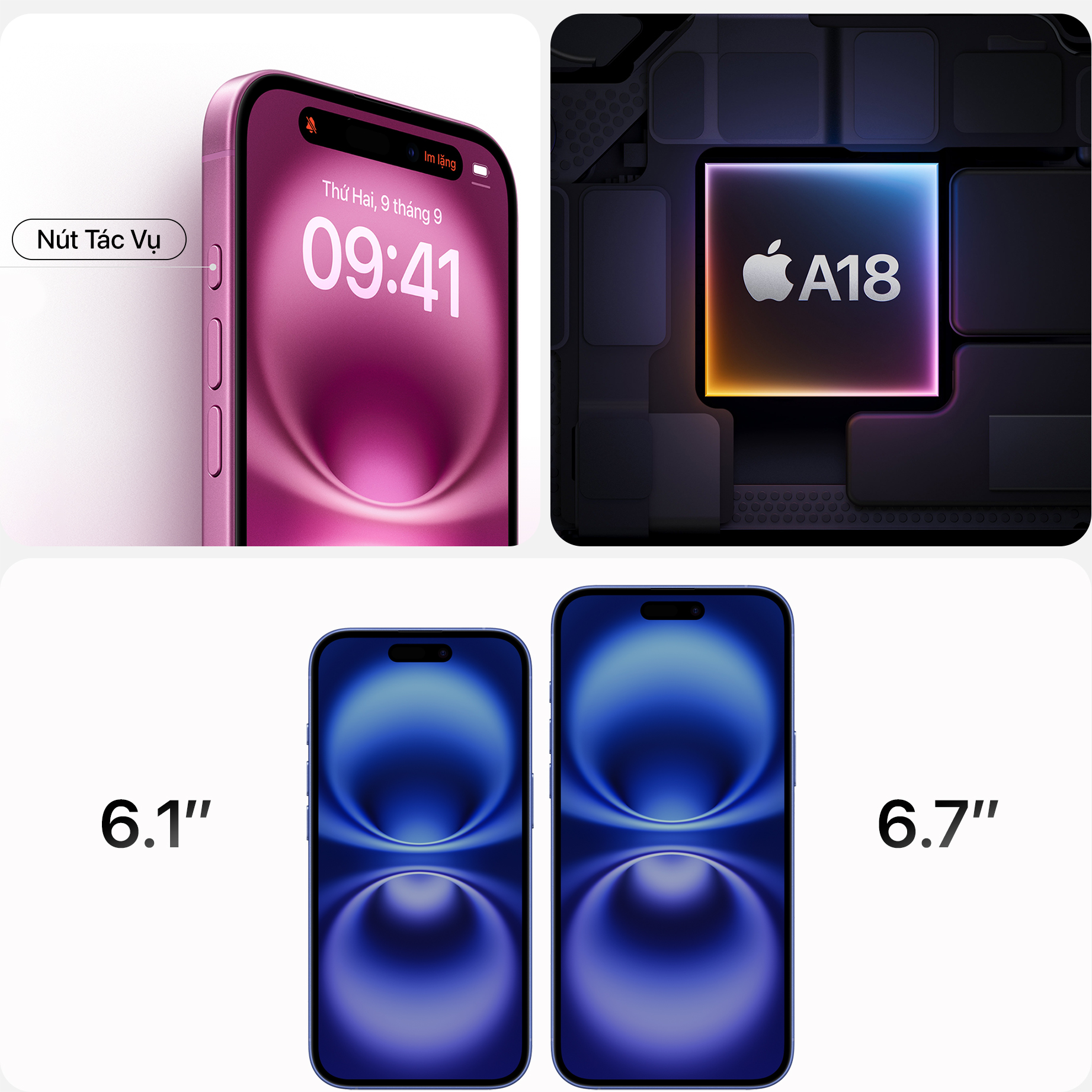 A18 là vi xử lý được thiết kế riêng cho iPhone 16 và iPhone 16 Plus, nó là một bước nhảy vọt so với A16 Bionic trên iPhone 15. Được sản xuất trên tiến trình 3nm tiên tiến nhất, A18 sở hữu 6 nhân CPU với 2 nhân hiệu năng cao và 4 nhân tiết kiệm điện năng, 5 lõi GPU được tối ưu hóa cùng công nghệ dò tia phần cứng tốc độ cao (Ray Tracing) mang đến hiệu năng đồ họa mạnh mẽ.