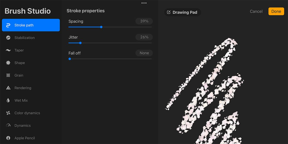 Trong menu Stroke Path, tùy chỉnh các cài đặt Spacing, Jitter và Fall off để đảm bảo chúng không phải là nguyên nhân khiến bút bị trục trặc. Các cài đặt này tăng (hoặc giảm) nét của Brush.