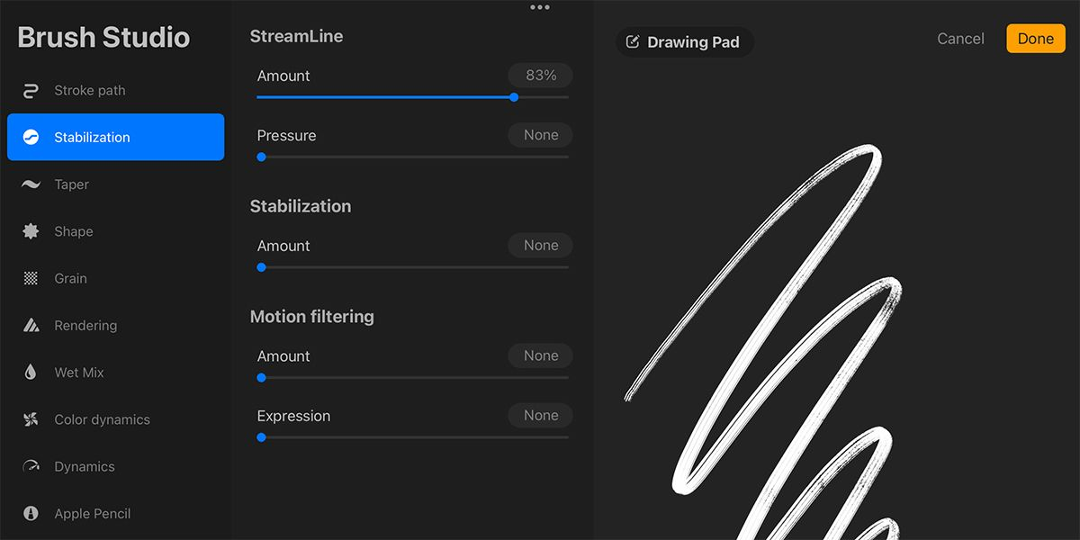 - Trong bảng Stabilization, bạn sẽ tìm thấy Motion Filtering. Nó được thiết kế để giúp những họa sĩ bị run tay vẽ các đường ổn định hơn, nhưng nó có thể ảnh hưởng đến sự cố trong Procreate nếu đặt sai cách. Thay đổi Amount và Expression để khắc phục.