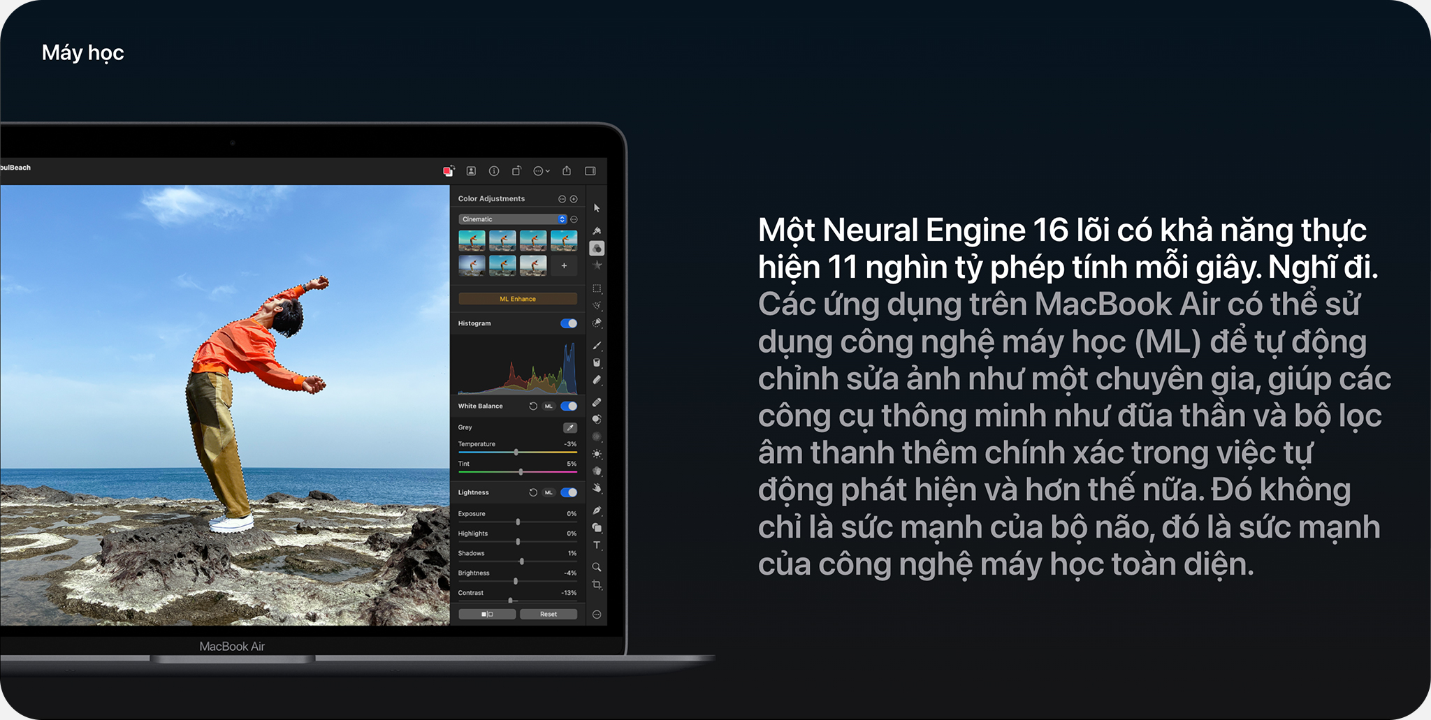 MacBook Air M1 là một chiếc máy nhỏ, nhẹ, mỏng cùng hiệu năng khá ấn tượng, chiếc máy này phù hợp với các bạn học sinh - sinh viên, nhân viên văn phòng và Designer. Chip M1 mang lại khả năng đa nhiệm mượt mà, cân mọi tác vụ văn phòng (Word, Excel, Power Point...) và vẫn có thể chỉnh sửa ảnh nhẹ nhàng trên các ứng dụng yêu cầu cao hơn như Photoshop, Lightroom.