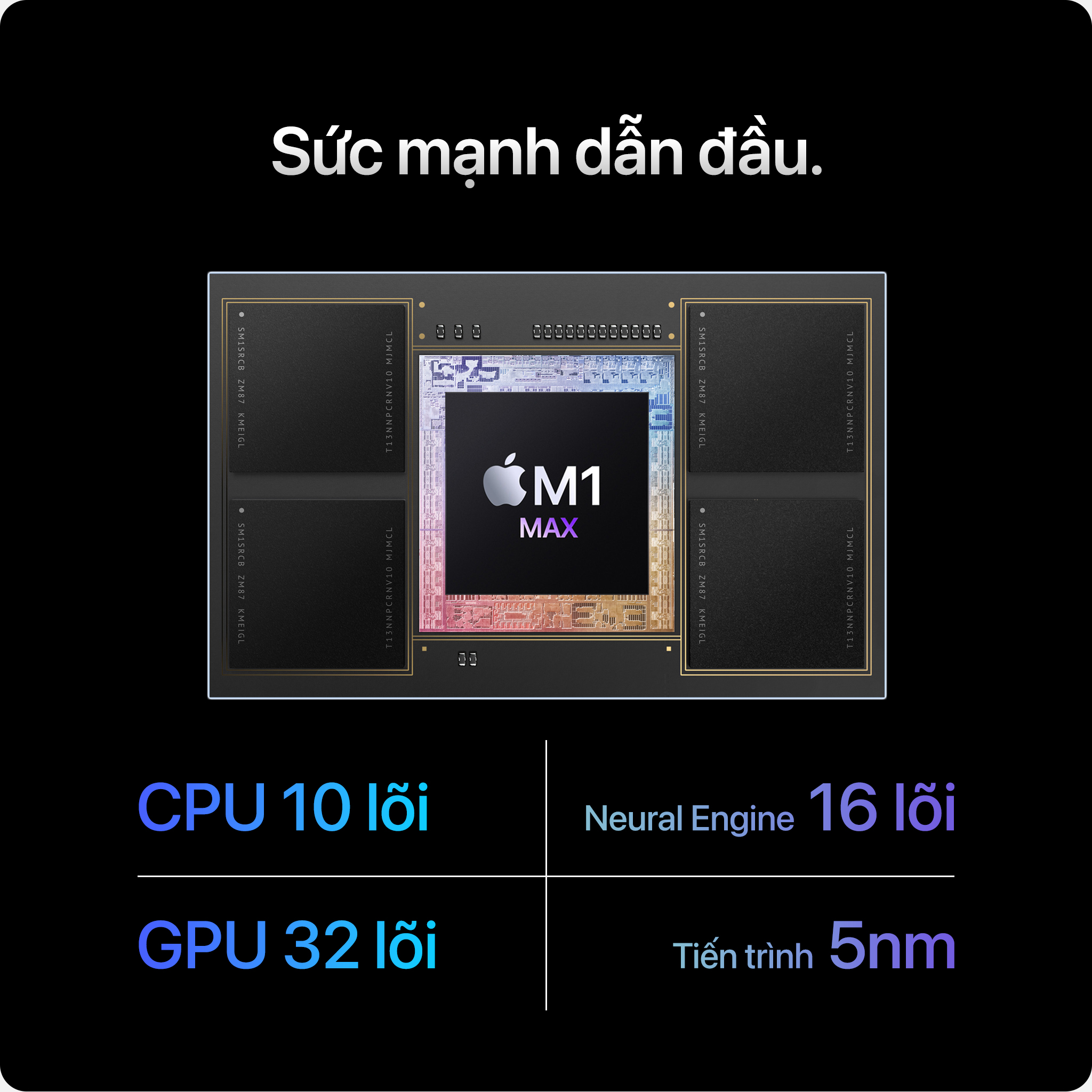 Apple M1 Max là phiên bản mạnh mẽ nhất trong dòng chip M1, được xây dựng trên kiến trúc ARM và sản xuất trên tiến trình 5nm tiên tiến nhất vào thời điểm 2021. Chip M1 Max bản cao cấp nhất có 10 nhân CPU, bao gồm 8 nhân hiệu năng cao và 2 nhân tiết kiệm năng lượng. Cấu trúc này đảm bảo khả năng xử lý mượt mà các tác vụ nặng như biên tập video, lập trình hoặc kết xuất video 3D. Đồng thời, 2 nhân tiết kiệm năng lượng được sử dụng khi thực hiện các tác vụ nhẹ nhàng hơn như lướt web, xem video hoặc soạn thảo văn bản, giúp tối ưu và duy trì thời lượng sử dụng Pin được lâu hơn.