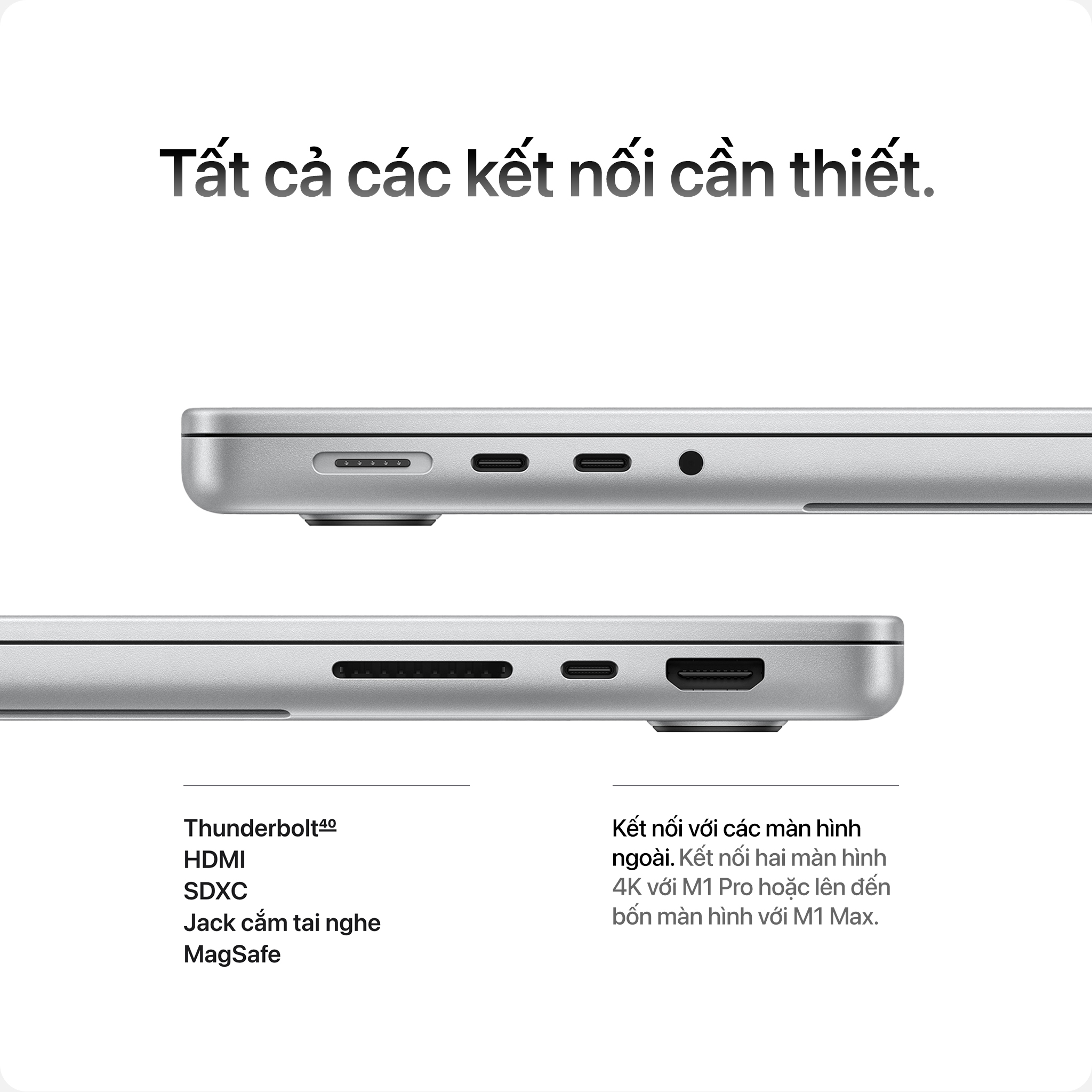 Về cổng kết nối, Apple đã lắng nghe người dùng và mang trở lại các cổng kết nối cần thiết như HDMI, Thunderbolt 4, khe cắm thẻ SDXC – tạo sự tiện lợi tối đa cho các nhà sáng tạo nội dung khi làm việc với nhiều thiết bị khác nhau. Ngoài ra, Jack 3.5mm và sạc Magsafe cũng được trang bị trên MacBook Pro phiên bản chip M1 Pro.