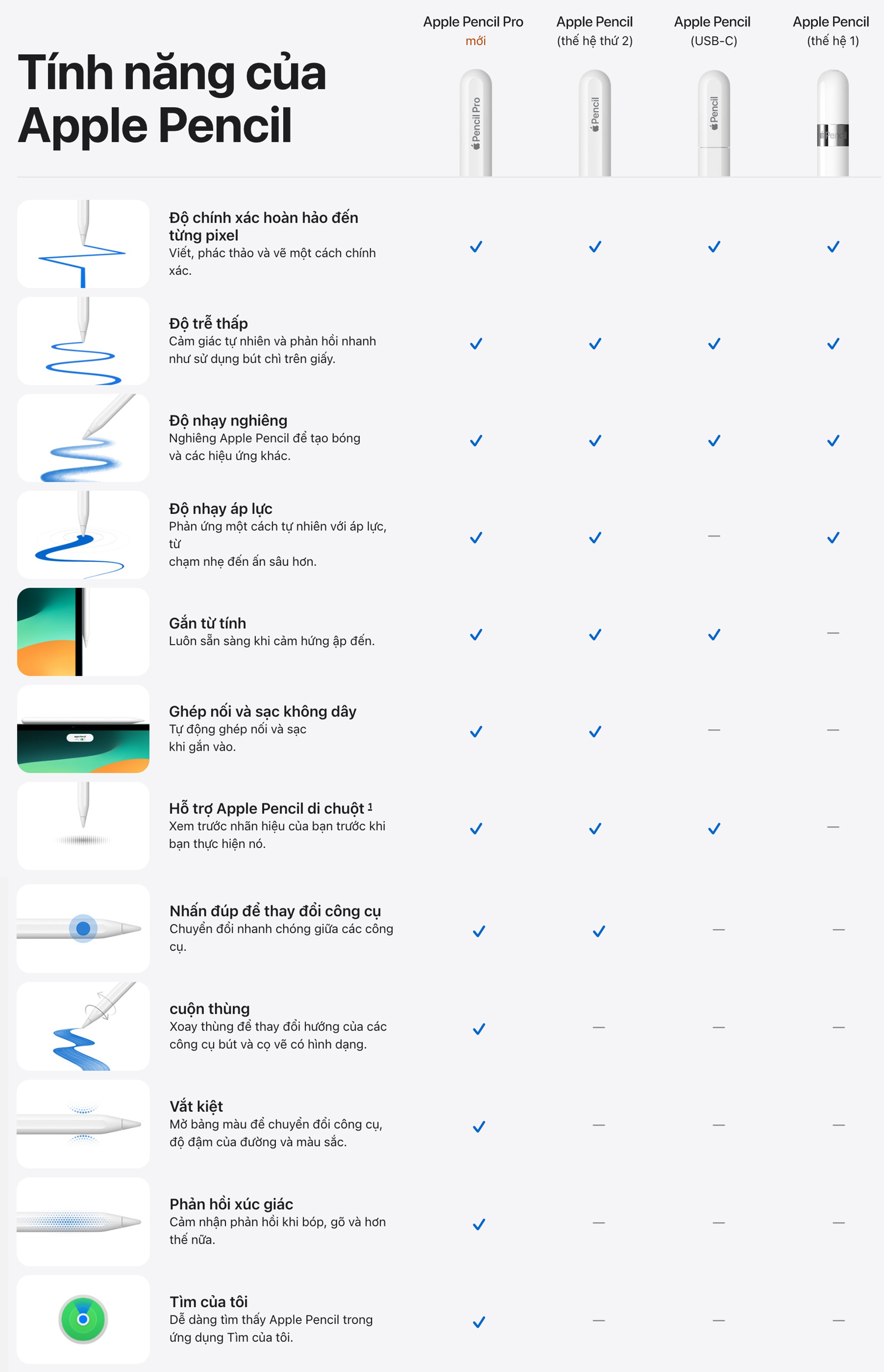 - Apple Pencil 2 và Apple Pencil Pro là 2 lựa chọn tốt hơn do các tính năng vượt trội. Tuy nhiên, để sở hữu các tính năng như: Double Tap, Cảm ứng lực nhấn, Sạc không dây... thì bạn phải bỏ ra thêm 50$ để mua chúng.