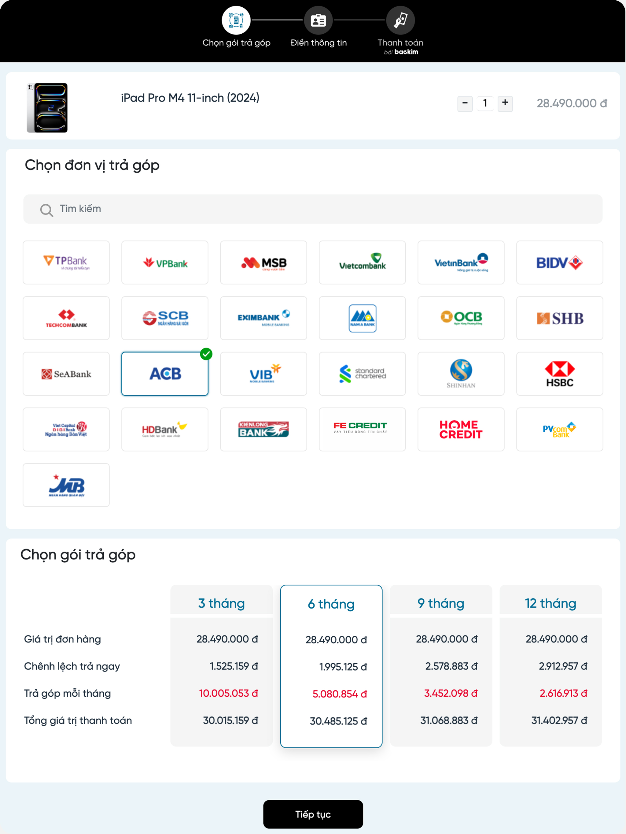 - Bước 2: Tiến hành chọn Đơn vị trả góp tương ứng với ngân hàng mà quý khách đang sử dụng, sau đó lựa chọn Gói trả góp phù hợp với quý khách và bấm Tiếp tục.